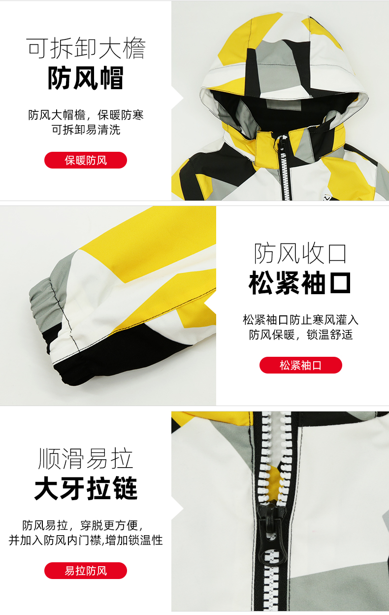 细节上:外层冲锋衣,时尚撞色设计合体版型,可拆卸风帽,紧密贴合头部,保暖又舒适,袖口魔术贴设计,下摆里层收腰防风裙式设计,防止冷风灌入,保暖性更佳。胸口带有3M反光条LOGO,简约大气,为夜间出行提供了安全保障。