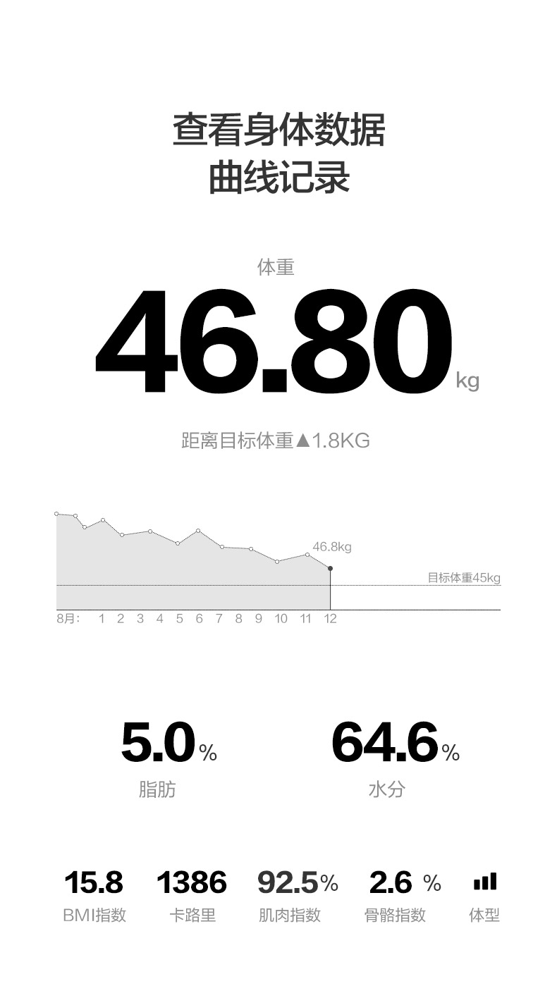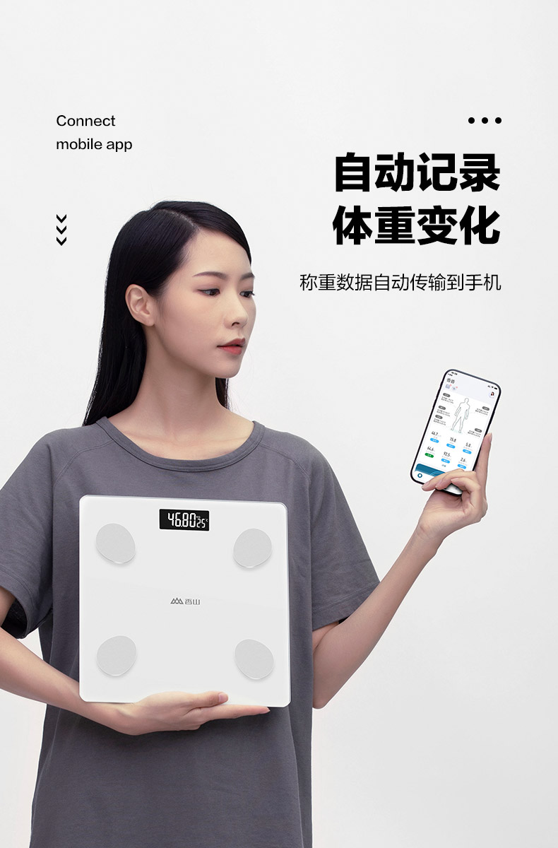 可监测12项身体数据,包括体重、体胖指数、BMI、水分、肌肉指数、蛋白质、身体年龄、基础代谢、活动代谢、骨骼肌量、体型、健康评分,在连接APP时,展现并自动分析你的数据,APP可制定你的瘦身计划和饮食规划,支持IOS和安卓。