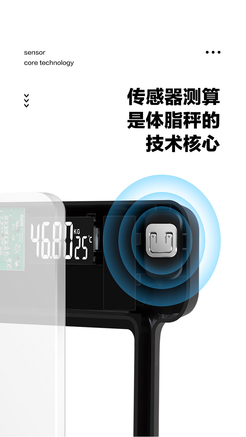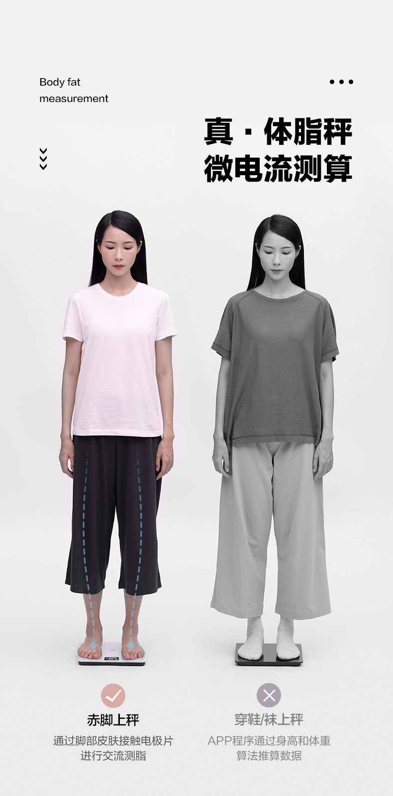一般的体脂秤在秤面都有电极片,其原理是通过脚部皮肤接触电极片后,使用交流测脂技术得到所需的身体数据。这款香山智能体脂秤,采用4点接触式电极测量法,通过配置电流和电压进行精准测量。