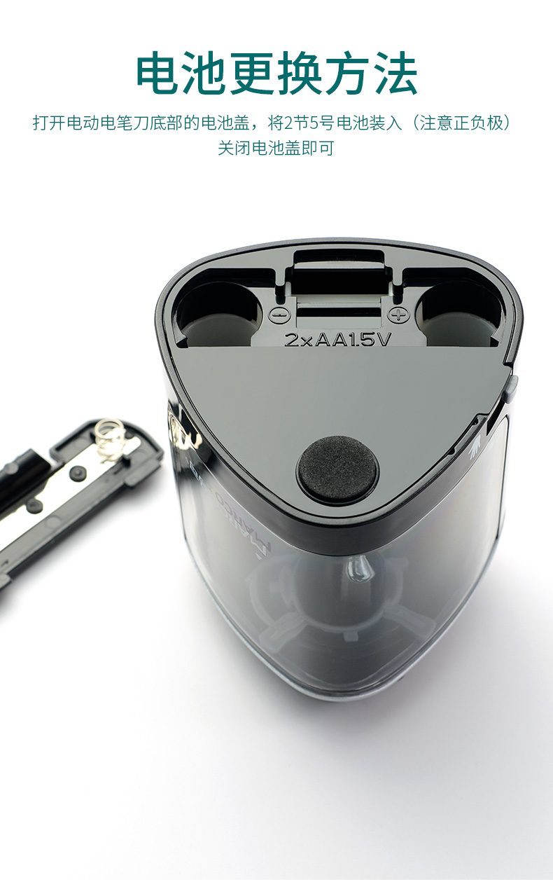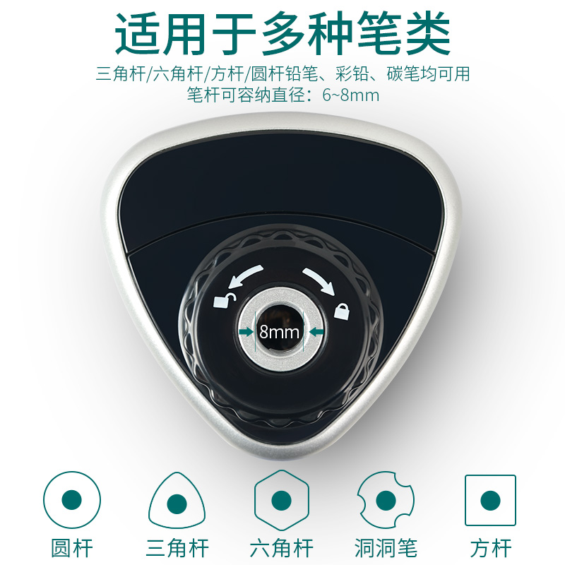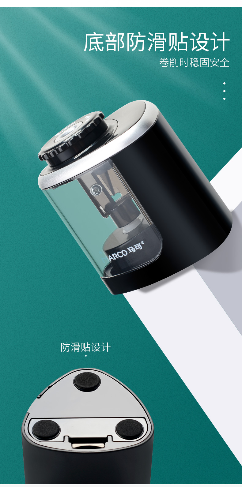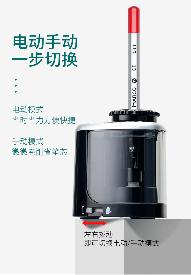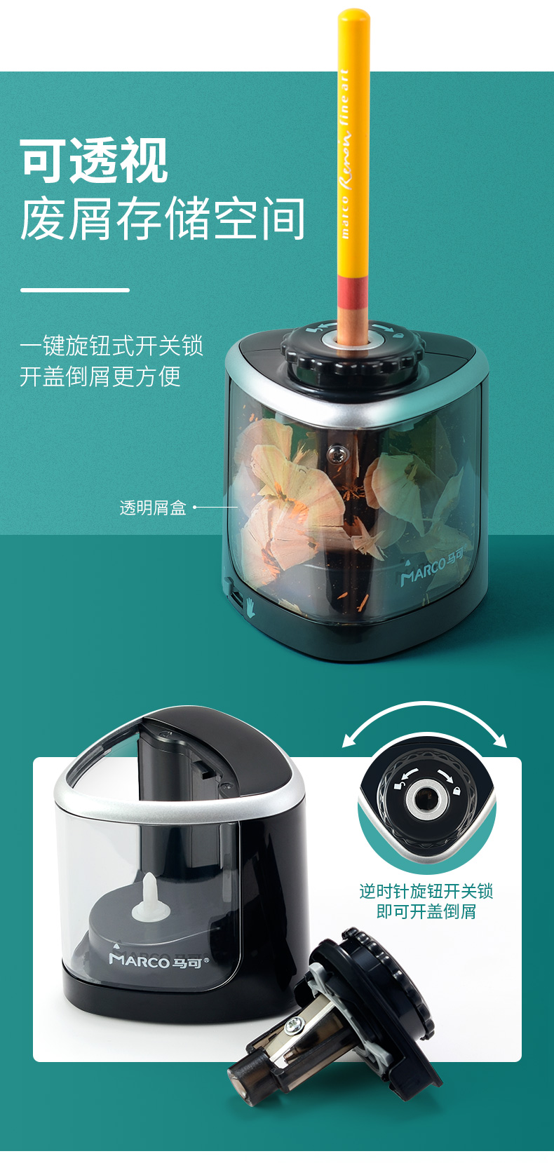 Marco马可电动削笔器,快速削笔,电动手动一步切换,适用三角杆、六角杆、方杆、圆杆铅笔、彩铅、碳笔多种笔类,笔杆可容纳直径: 6~8mm,可透视废屑储存空间,一键旋钮式开关,清理更方便。使用2节5号电池。