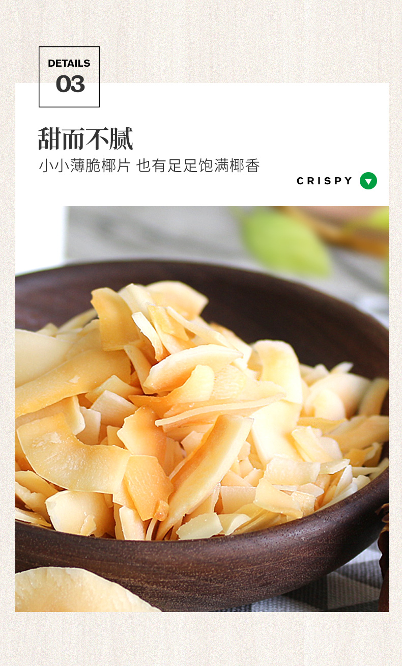 天猫南国食品旗舰店29.9元,下单立减5元,可领5元优惠券,实付19.9元到手,海南老字号南国 香脆椰子片,热销722万袋。海南新鲜椰子肉为原料,传统碳烤工艺而成,保留原有椰香口感,薄脆香浓,一口清爽,甜而不腻。