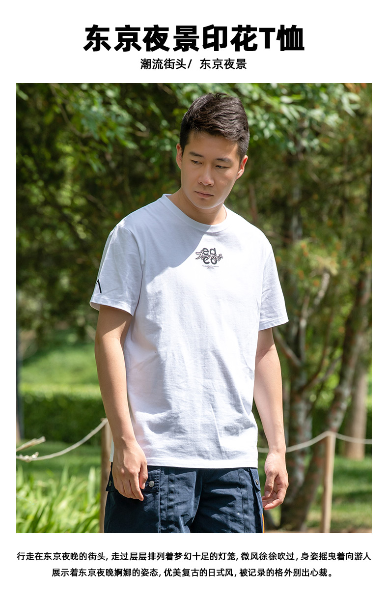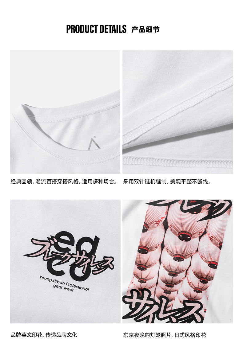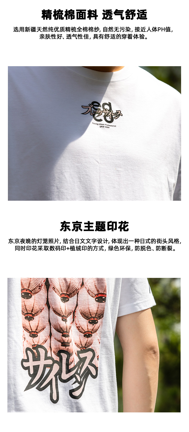 在款式上,合身版型,立体剪裁,简约舒适,后脖颈无感标签,后背是东京夜晚的灯笼图案印花还结合了日文文字设计而成,体现出一种日式的街头风格,印花采取数码印+植绒印的方式,绿色环保、防脱色、防断裂。