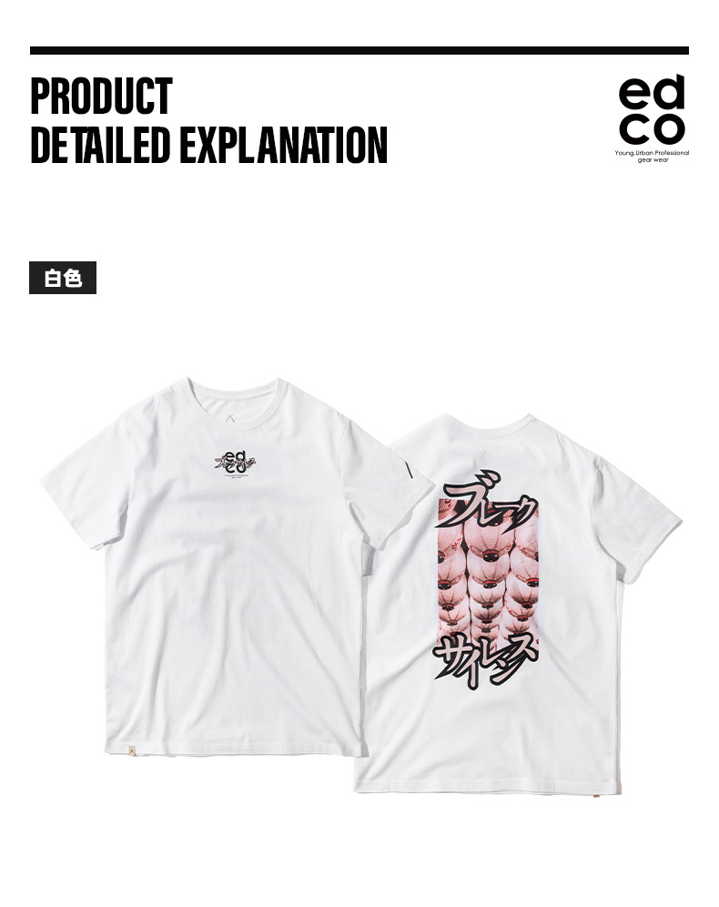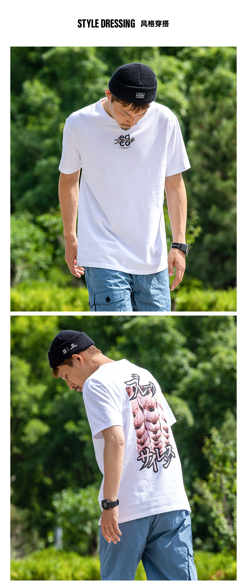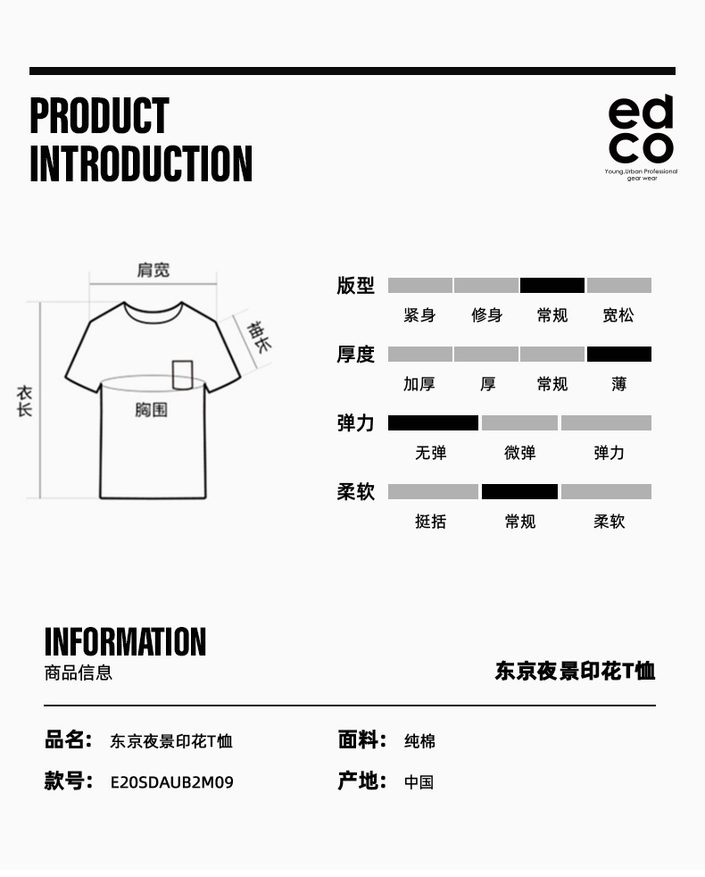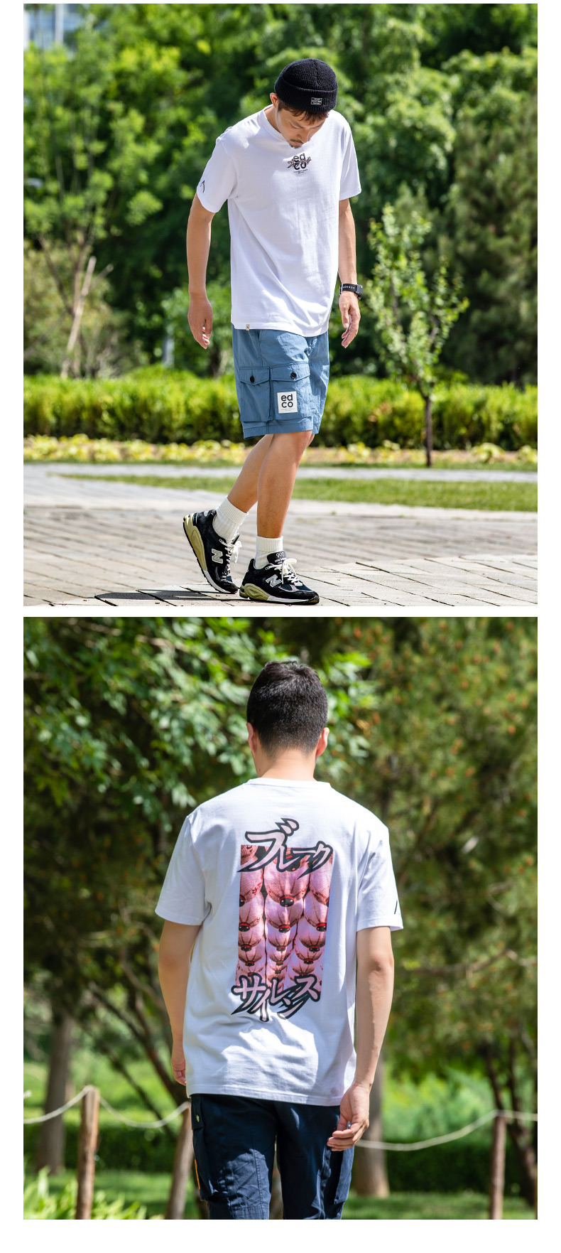 在款式上,合身版型,立体剪裁,简约舒适,后脖颈无感标签,后背是东京夜晚的灯笼图案印花还结合了日文文字设计而成,体现出一种日式的街头风格,印花采取数码印+植绒印的方式,绿色环保、防脱色、防断裂。