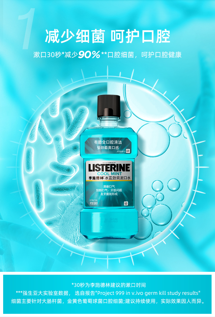 李施德林漱口水,可深入清洁口腔内部难刷部位,杀灭隐藏在牙缝间及刷牙后残留的细菌,比单靠刷牙更能有效减少牙垢膜及牙龈炎的形成。