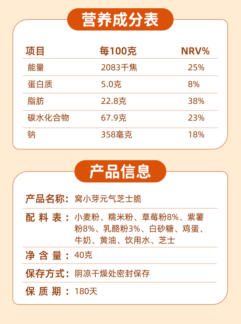 这款窝小芽元气芝士脆,是一款果蔬奶酪磨牙棒饼干,使用荷兰进口帕玛森芝士、优质小麦粉、全脂乳粉为主料,运用恒温烘焙技术物理膨化而成,非油炸更健康,口感酥脆。