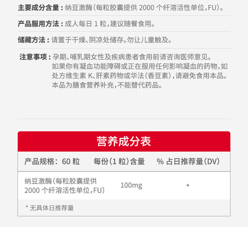 不含嘌呤和K2。每粒胶囊含2000个纤溶活性单位,成人每日一粒,随餐服用,1瓶可吃2个月。
