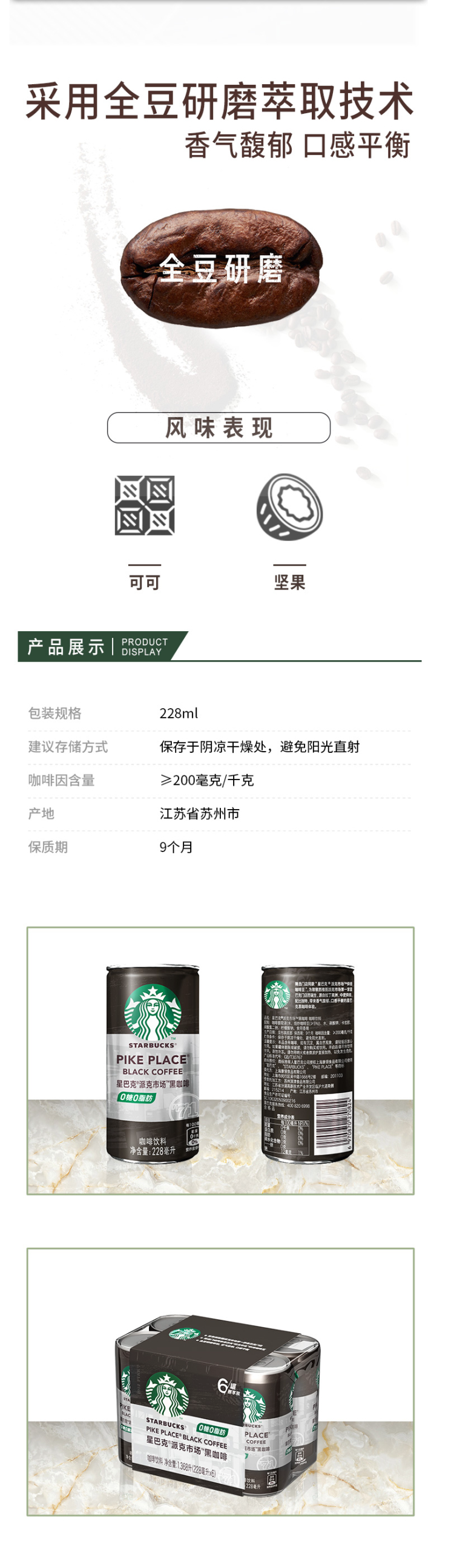 这款星巴克即饮黑咖啡,精选门店同款“派克市场”烘焙咖啡豆,咖啡香气馥郁突出,口感均衡,入口微苦,回味甘醇。0糖、0脂、0卡路里,好喝不胖。
