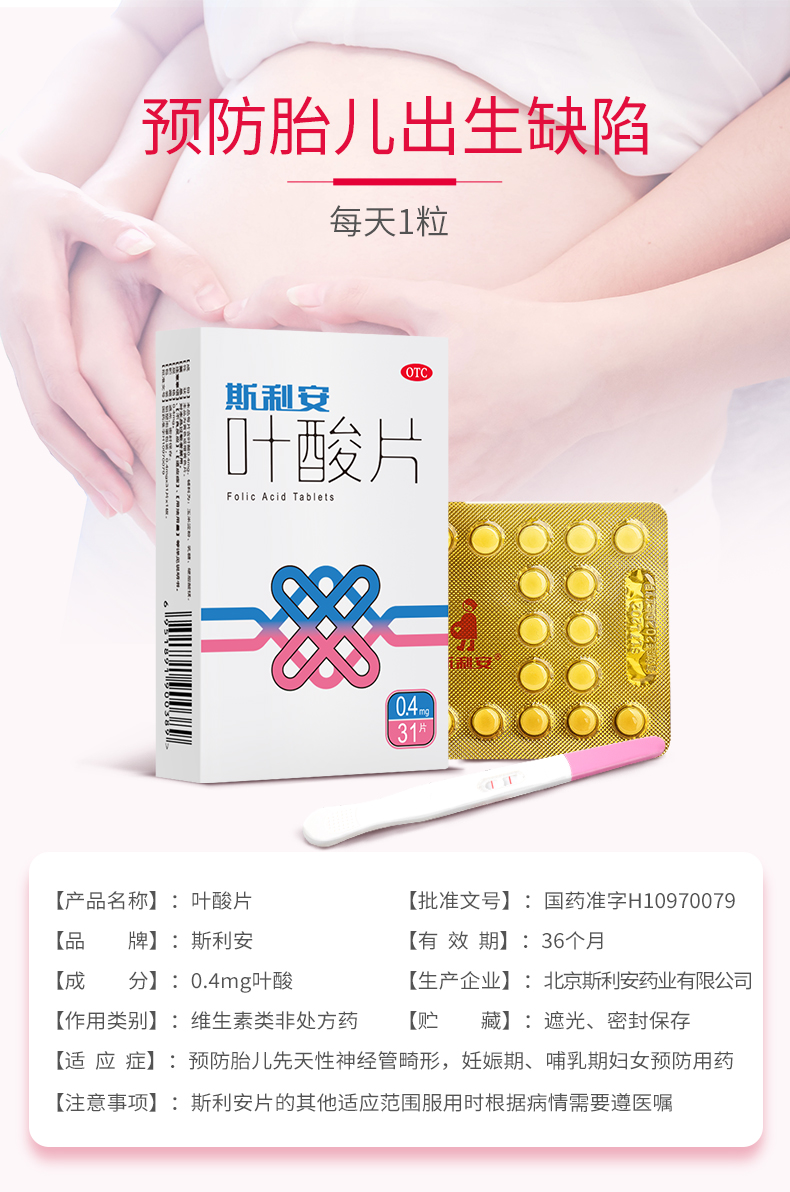 这款斯利安 孕妇叶酸片,标准含量0.4mg,能预防胎儿先天性神经管畸形,是女性备孕期、孕期和哺乳期的必备服用药品,线下药店也有售。