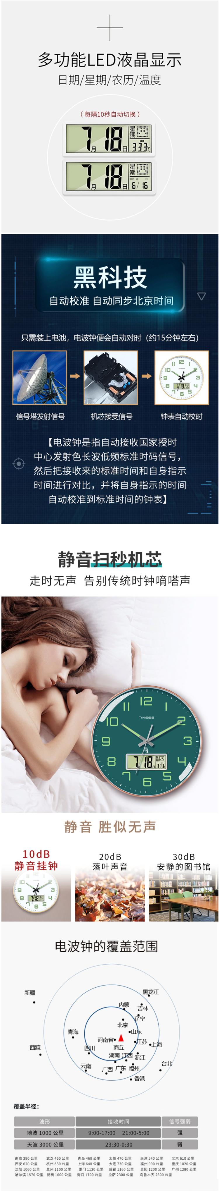 升级光感液晶屏,搭配高灵敏光感器,在黑暗的环境下屏幕柔光自动开启,在漆黑的夜里也能看清时间和万年历。能显示日期、星期、农历、温度。静音扫描机芯,走时无声不扰人。