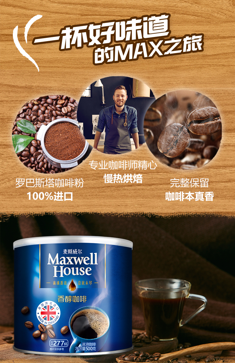 天猫麦斯威尔旗舰店79元,可领10元优惠券,实付69元到手。下单赠送定制勺+咖啡伴侣+咖啡杯。这款麦斯威尔香醇咖啡是英国原装进口,使用的是100%罗巴斯塔咖啡粉,由资深咖啡师精心烘焙,完整保留咖啡本真香味,规格为500g,单罐可冲277杯。