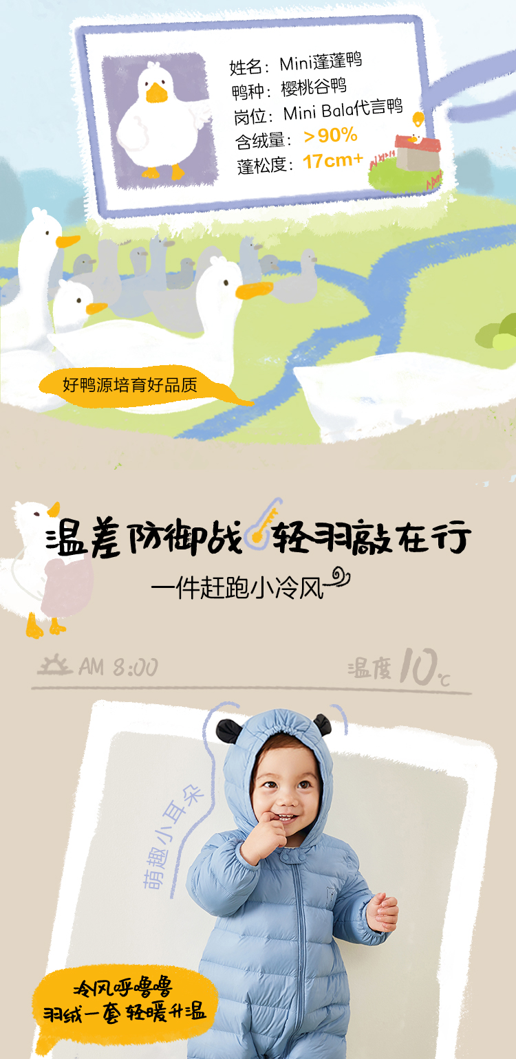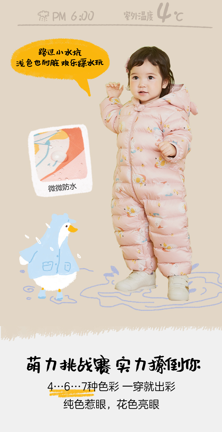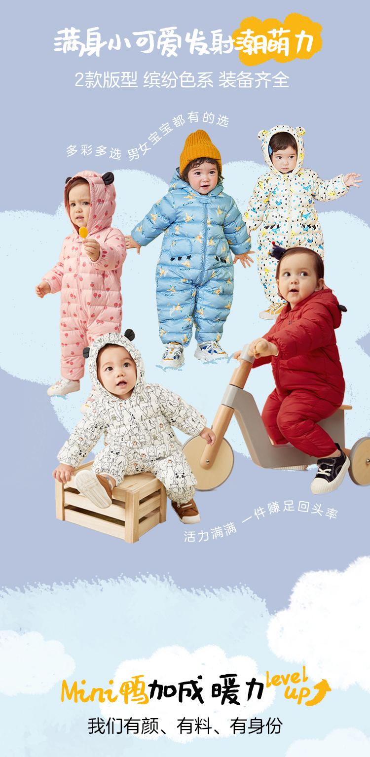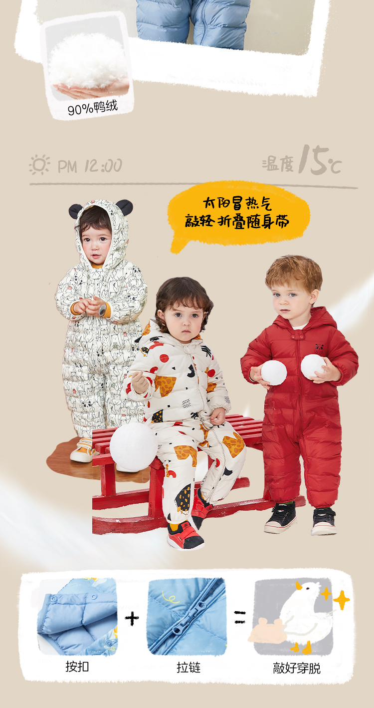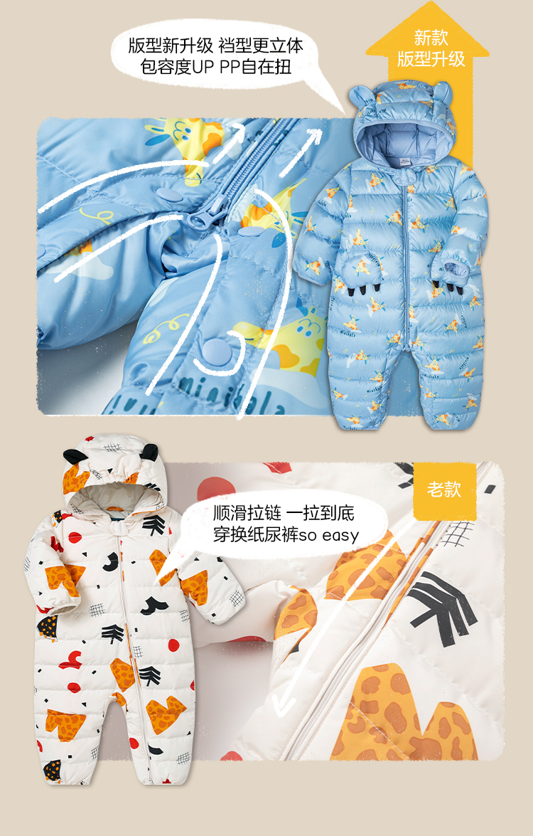 天猫minibalabala旗舰店339.9元,可领180元优惠券,实付159.9元到手,迷你巴拉巴拉,轻薄羽绒连体衣 又轻有暖 萌趣可爱。A类品质,白鸭绒含绒量90%,舒适保暖,贴心呵护,宝宝穿的舒心,妈妈一百个放心。