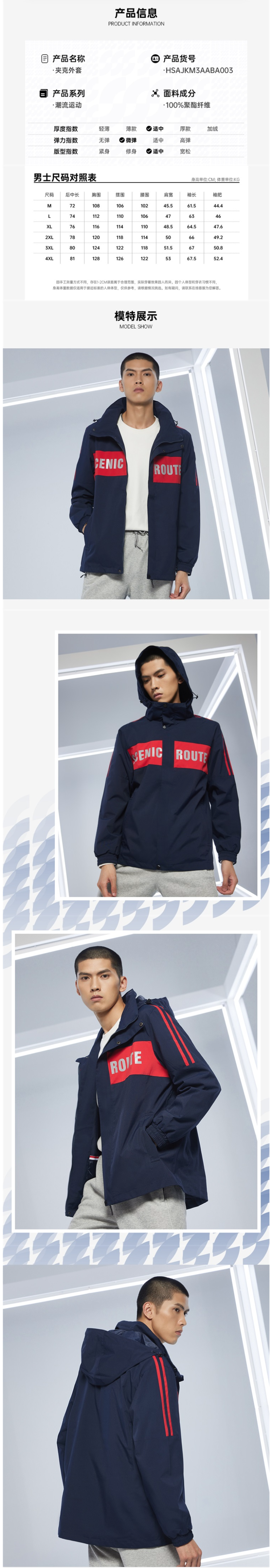 在款式上,合身版型,经典运动风衣款设计,加大加宽的头盔式防风帽,搭配半高领,能很好的防风不漏风,双重门襟,两侧插袋有拉链,置物安全,弹力袖口。