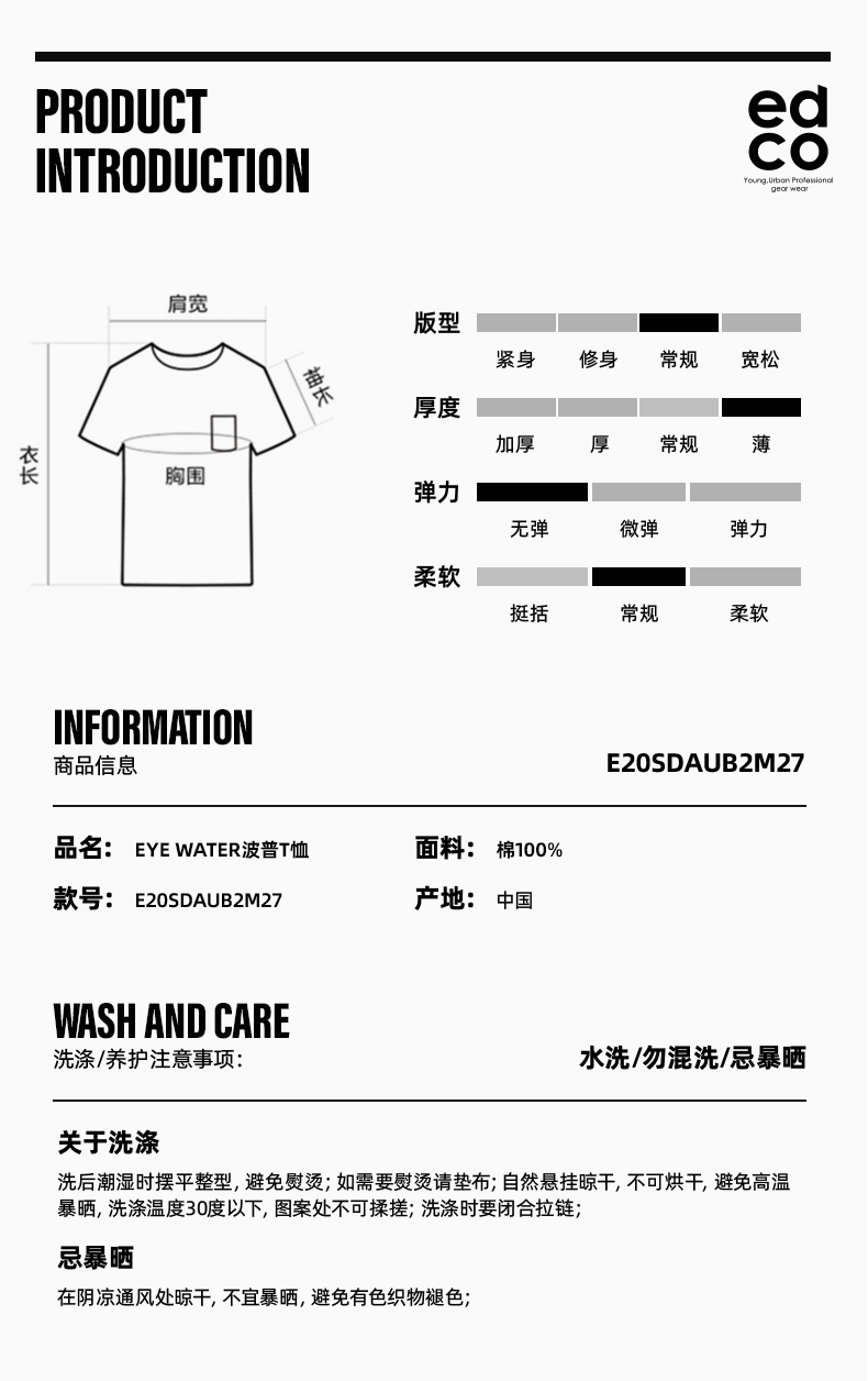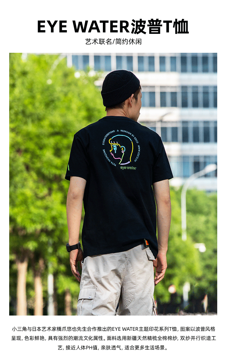 这款艾德克EDCO是与日本艺术家橋爪悠也先生合作推出的EYE WATER主题印花系列T恤,艺术家将自己的经典“雀斑女孩”系列画作重新诠释,创作出了EYE WATER主题系列图案,结合小三角的英文标识,获得更强的潮趣属性。