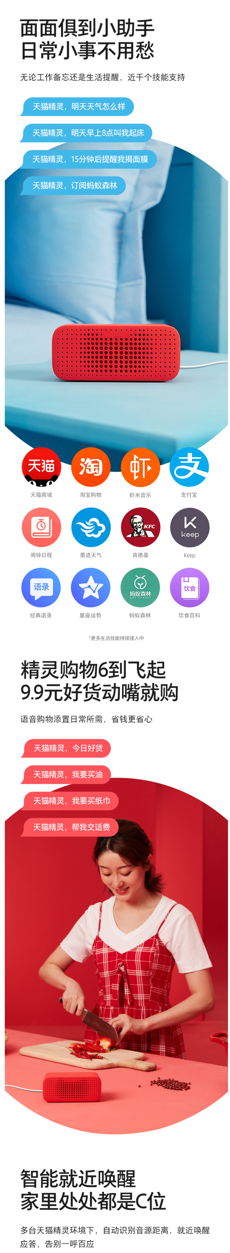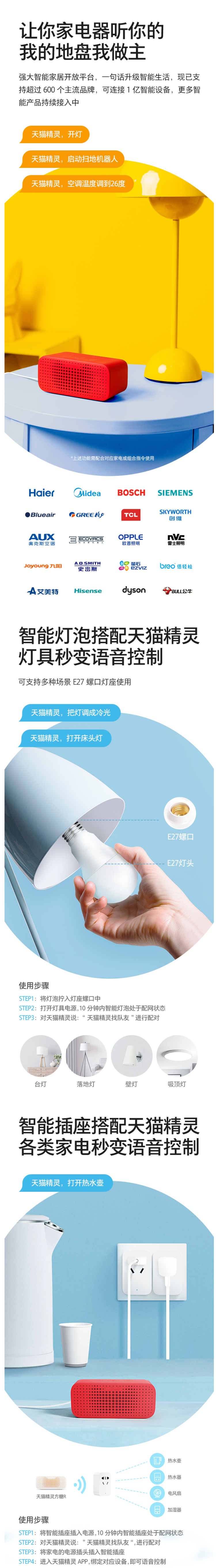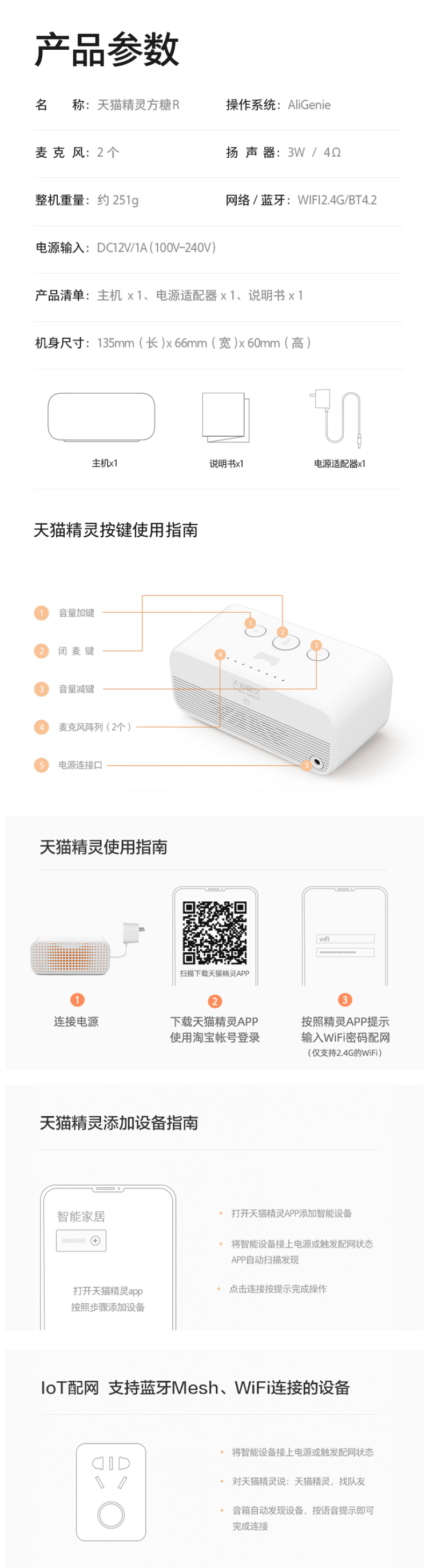 方糖R支持声纹购物和dts音效。可以通过使用天猫精灵支持的智能插座和万能红外遥控,可轻松控制20000款传统家电,已支持百款阿里智能设备,涵盖空调,空气净化器,加湿器等等。
