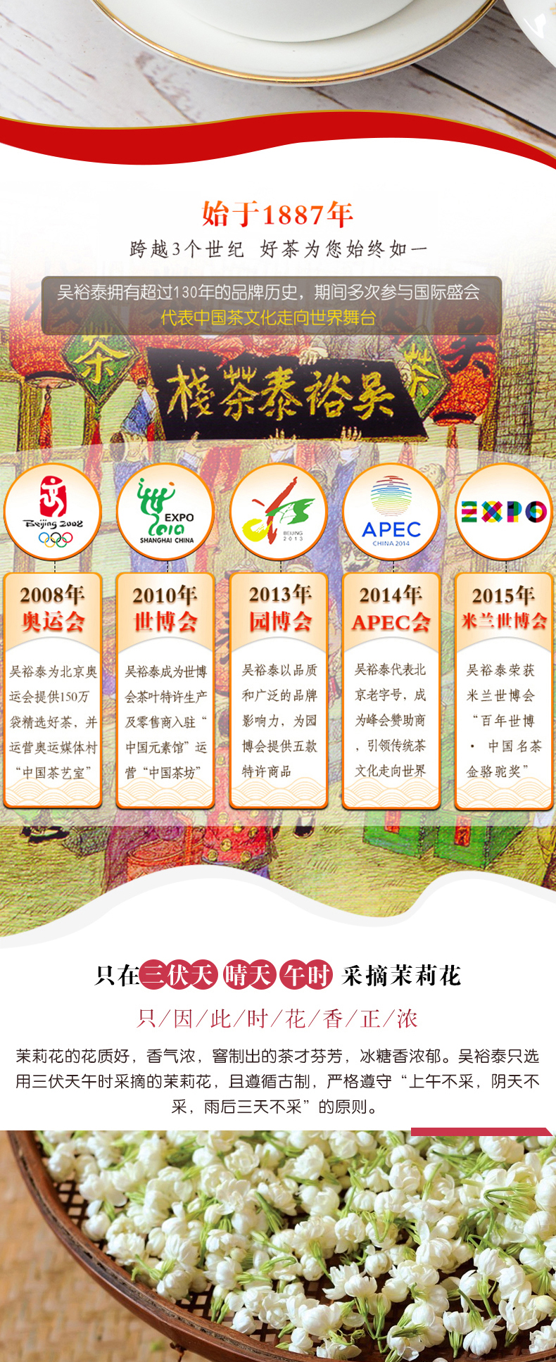 始创于1887年,由吴裕泰茶栈、吴裕泰茶庄演变、发展而来,至今已有120余年的历史。分店遍布北京的大街小巷,是国家商务部首批认定的“中华老字号”。2019年11月,《国家级非物质文化遗产代表性项目保护单位名单》公布,北京吴裕泰茶业股份有限公司获得“花茶制作技艺(吴裕泰茉莉花茶制作技艺)项目”保护单位资格。