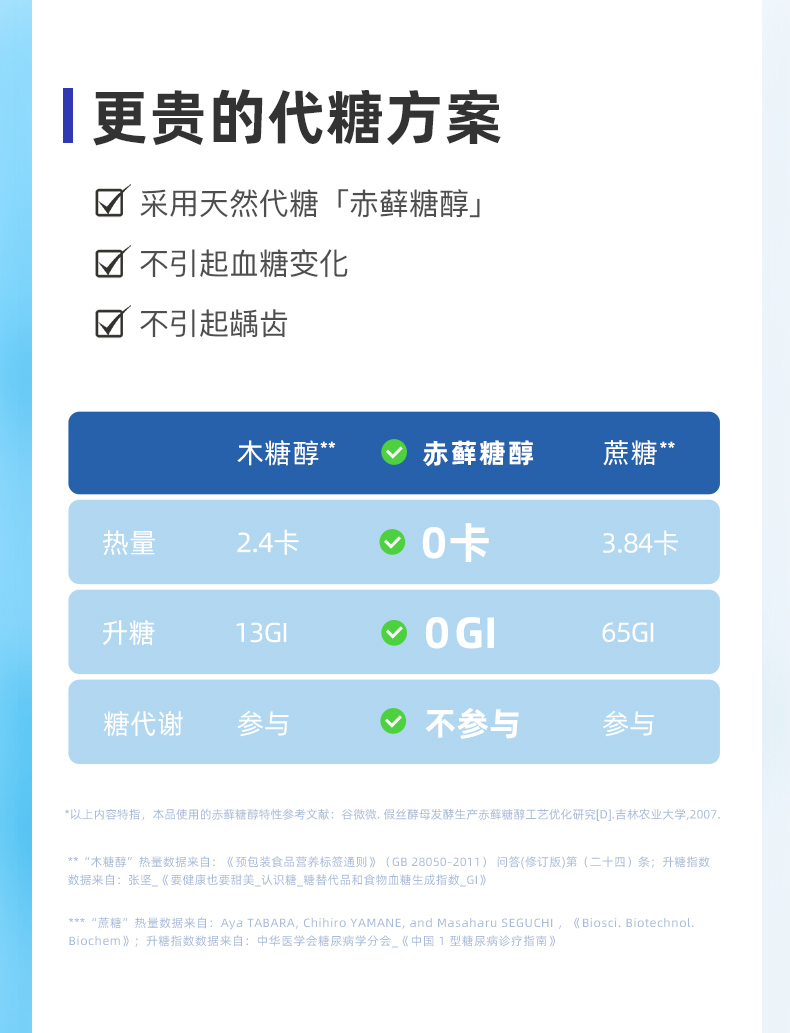 赤藓糖醇的吸收并不影响血浆中葡萄糖和胰岛素水平,这使得赤藓糖醇成为适合糖尿病人食用的甜味剂。赤藓糖醇能量系数为0KJ/g,且不会导致龋齿蛀牙。