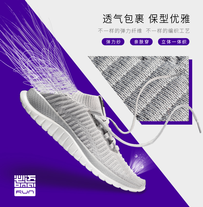 必迈这款鞋的鞋面,采用流行的针织袜套设计,鞋带主要是装饰,还是一脚蹬方式穿。传统鞋面是多块拼接,再用线缝在一起,而针织鞋面是由纱线一体编织而成,就像织毛衣,同时鞋面和鞋舌也是编织连在一体的,没有了缝纫处的摩擦,包裹感极舒适,透气也特别好,如袜子般舒适贴脚,就像冬天穿毛线袜子那种感觉。