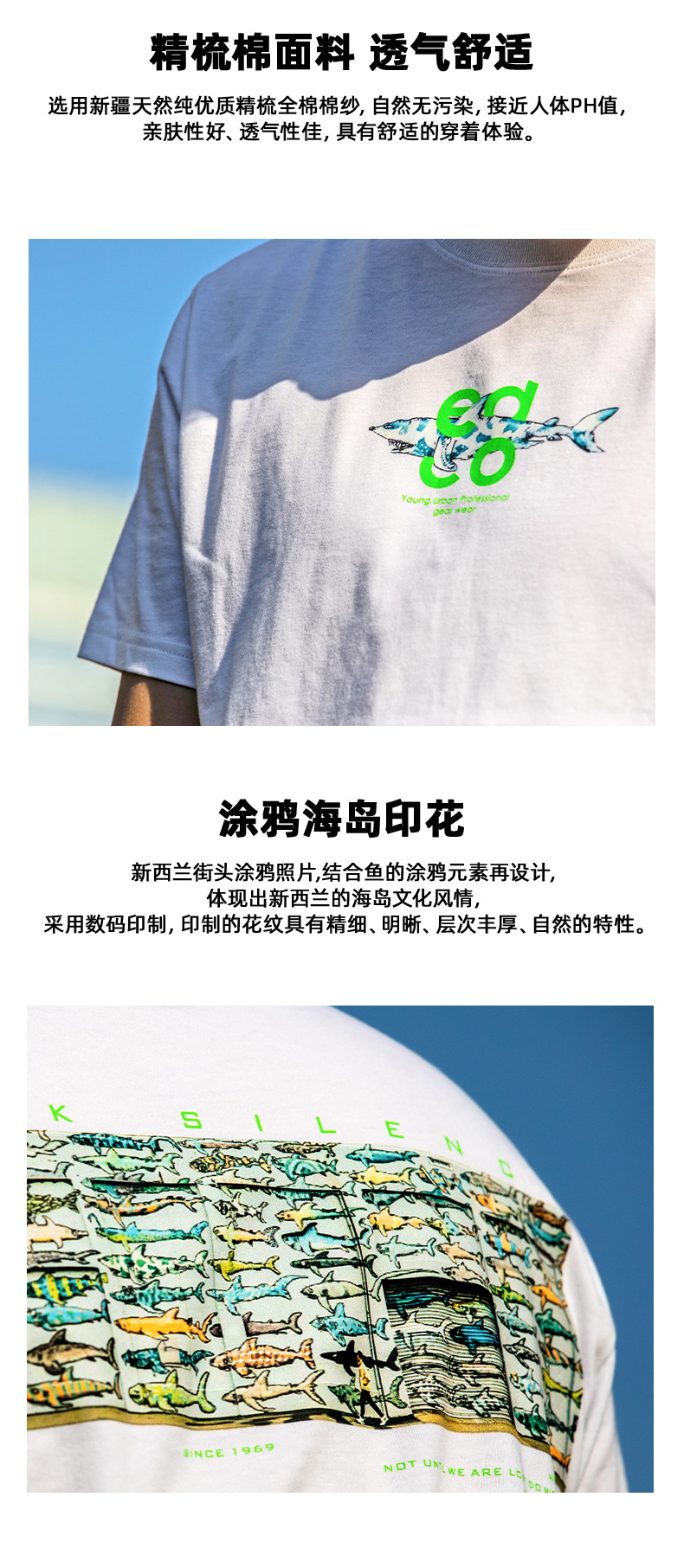 这款艾德克EDCOT恤,衣身上印有街头涂鸦主题的图案,新西兰街头涂鸦照片结合鱼的涂鸦元素设计而成,体现出新西兰的海岛文化风情。采用数码印制,印制的花纹精细、明晰、层次丰厚、自然。