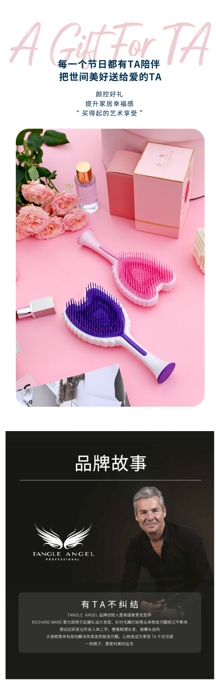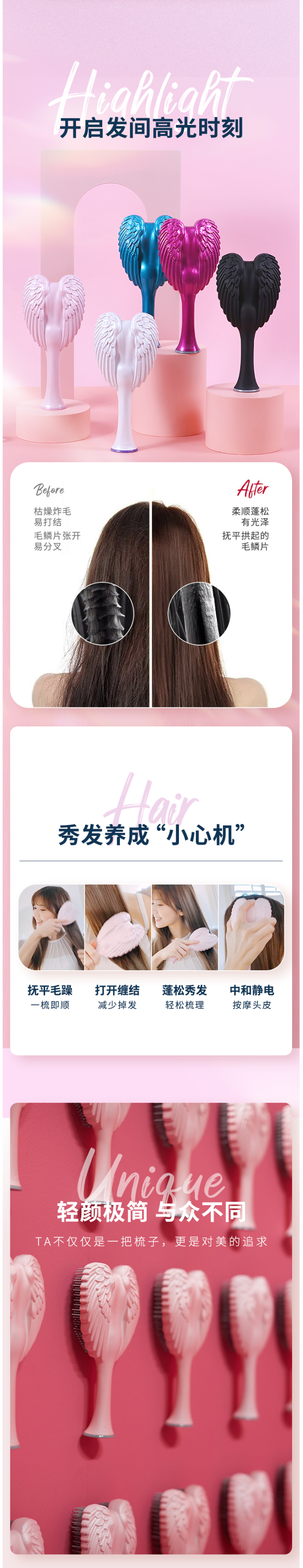Tangle现有美发梳和宠物梳,不同款式和大小,型号很多,但人气最高的,依然是「Tangle Angel天使美发梳」、「Tangle Teezer便携美发梳」这两款。