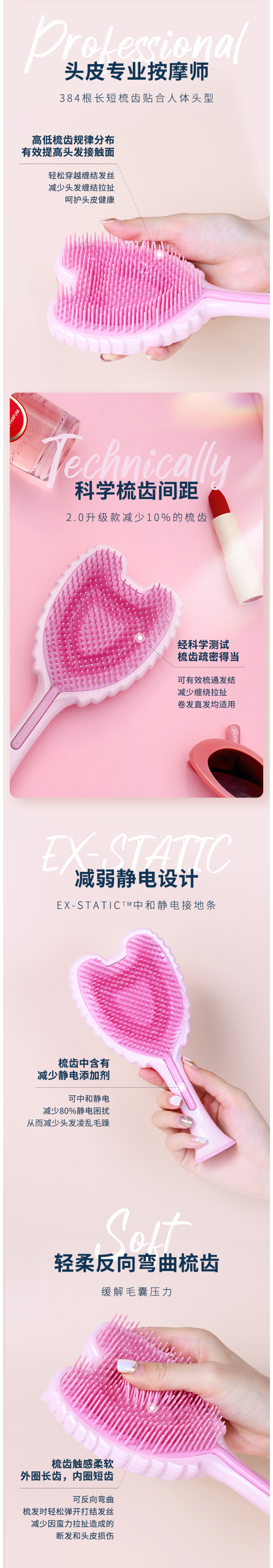 它的神奇之处在于无论是卷发、直发还是乱糟糟的头发,无论顺梳还是倒梳,无论干发湿发,都能一梳到底,打结的头发轻轻一梳就开,防静电并且避免拉扯发根,丝毫没有扯痛头皮的感觉,防止拉断或者拉脱头发,极大减少掉发,尤其适合长发妹纸。