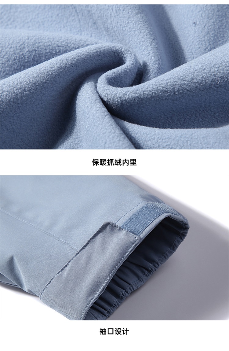 双重门襟,能更好的保暖,魔术贴袖口。外套与内胆是用拉链连接,内胆抓绒是立领,两侧口袋有拉链。