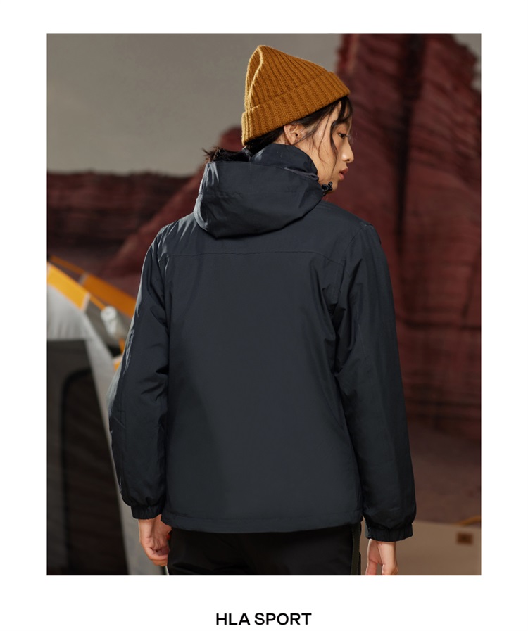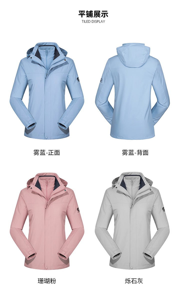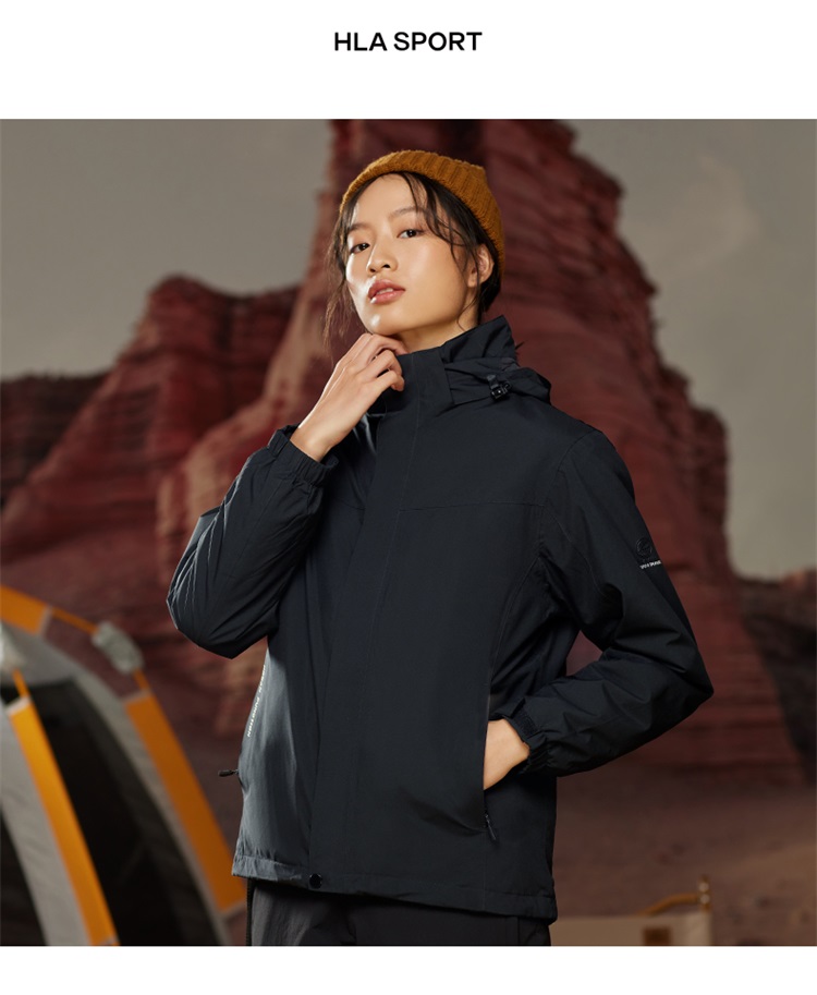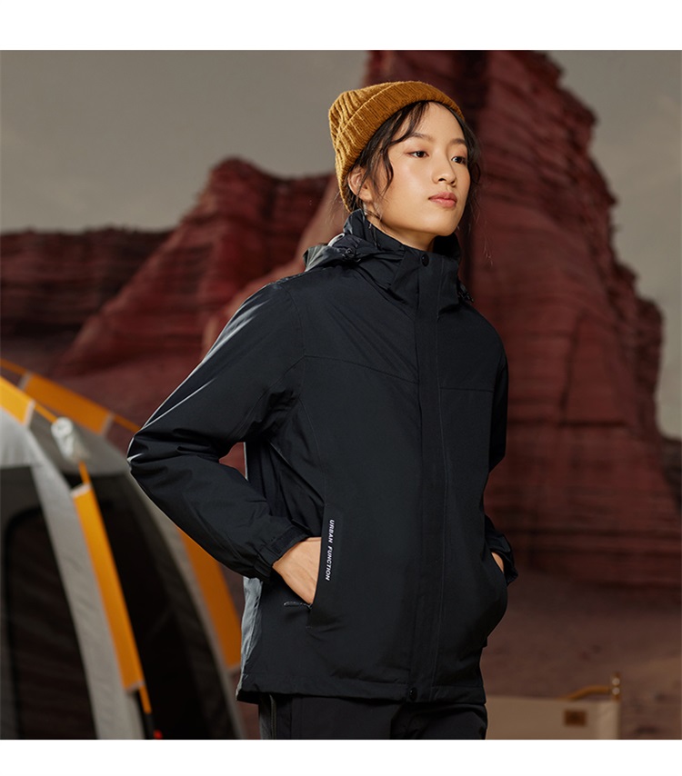 外层是100%聚酯的功能防护面料,具有防风、防水、耐磨的优点,有三合一系统,可与自家的内胆搭配穿。