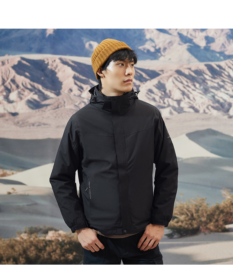 在款式方面,外层冲锋衣是宽松版型,不挑身材都能穿。帽后有弹力抽绳,可通过调节松紧来实现帽子的高低。帽口两侧有调节绳扣,风雨雪天气下收紧帽口即可,防护严实,还不影响转头时的视线。