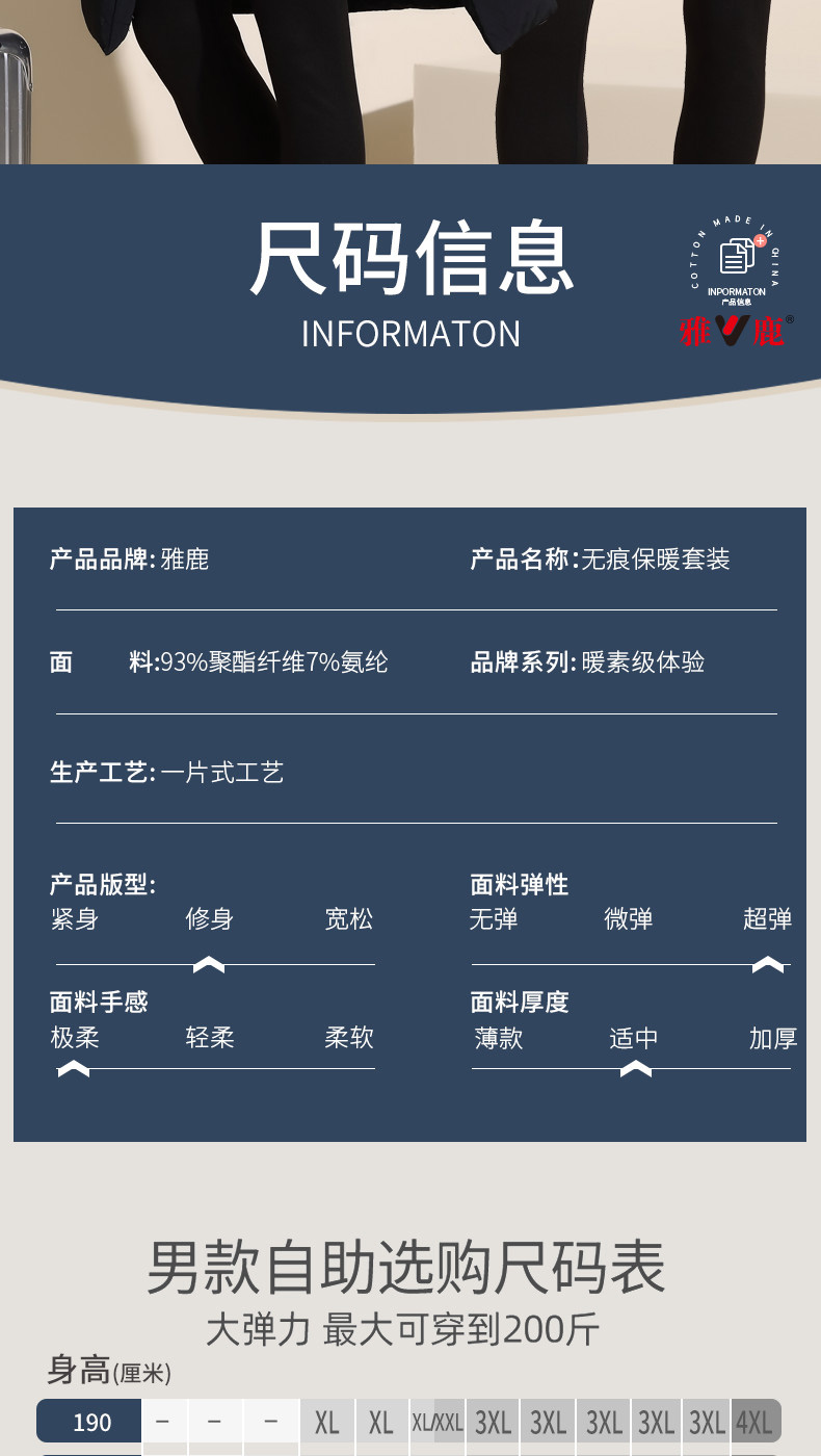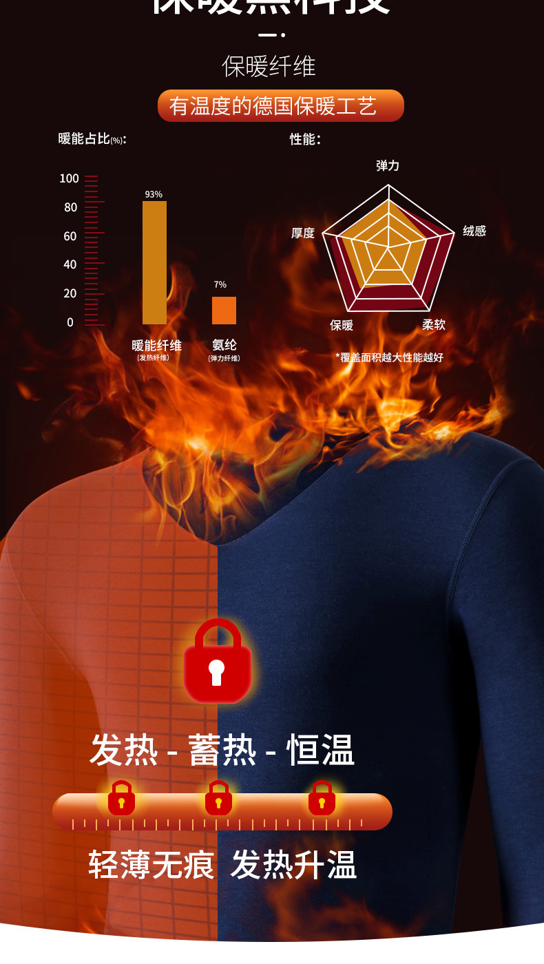 精选科技保暖面料,面料柔软细腻,亲肤顺滑,内里磨绒工艺,轻盈无感,不易起球,不易褶皱,保暖贴身更舒适,面料主要成分为93%聚酯纤维+7%氨纶,整体无痕工艺,可随意裁剪,不散边卷边,贴身打底穿着不臃肿,温暖无负重,带来贴身柔软舒适体验。