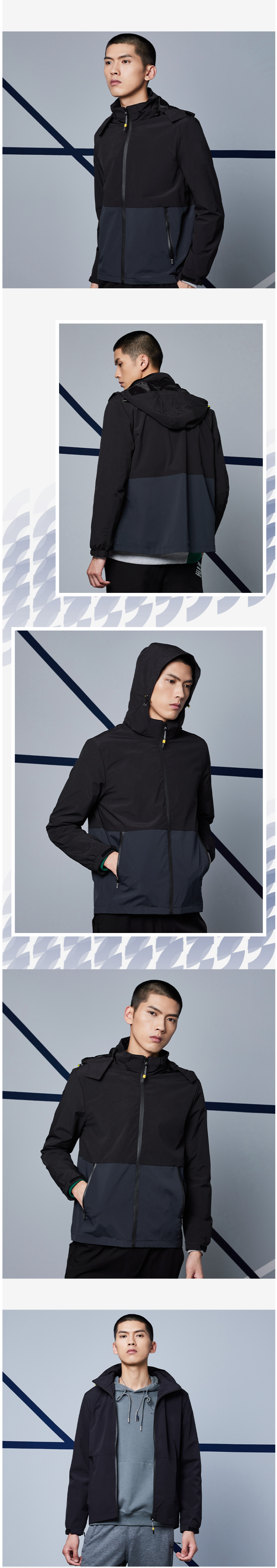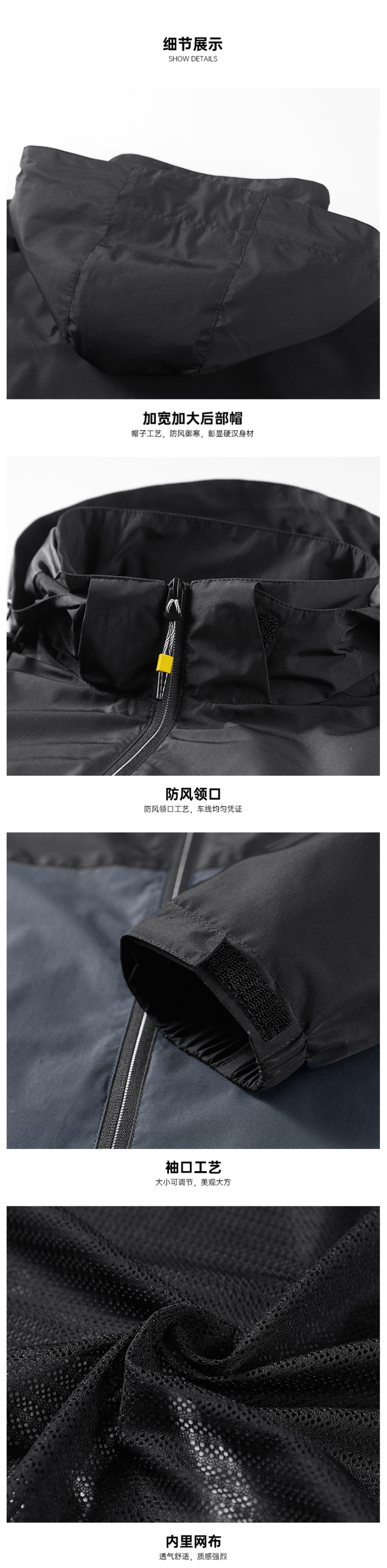 在款式上,合身版型,3D立体剪裁,经典运动风衣款设计,加大加宽防风帽搭配半高领,能很好的防风不漏风;内里是网衬更透气,两侧插袋有拉链,置物安全,魔术贴袖口。