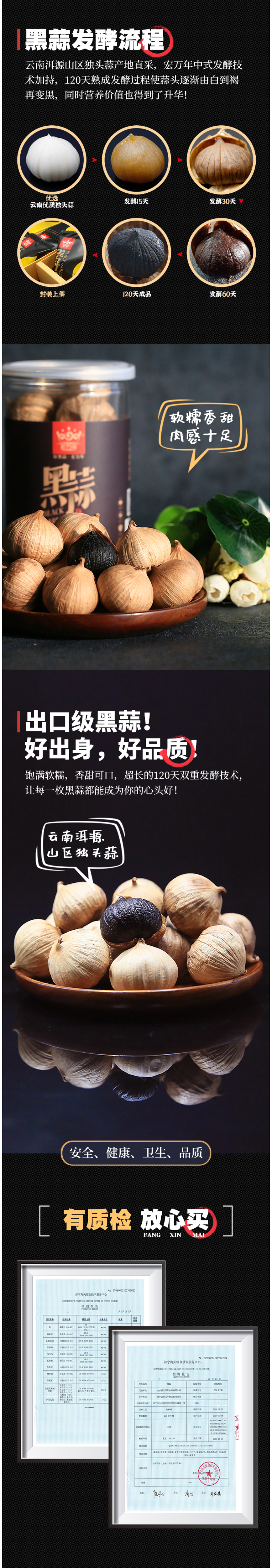 宏万年选用产自洱源的上好高原独头大蒜为原料,使用中式发酵技术,在生产过程中无污染、无添加,历经120天熟成,发酵过程使蒜头逐渐由白到褐再变黑,同时营养成分含量更为丰富。