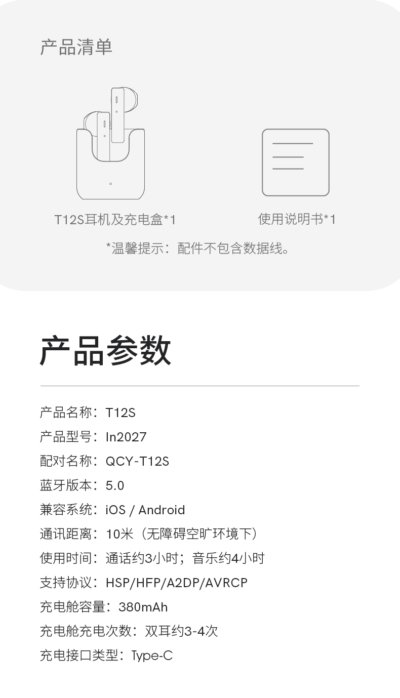 天猫qcy旗舰店109.9元,可领10元优惠券,实付99.9元到手,QCY此款T12S无线蓝牙耳机采用全新的简易无盖式设计,13mm发音单元,支持AAC/SBC音频编码,四麦高清通话降噪。支持弹窗配对,可通过APP进行自定义调节、OTA升级等。满电状态下,可连续播放约4小时,配合充电仓能够实现20小时总续航。