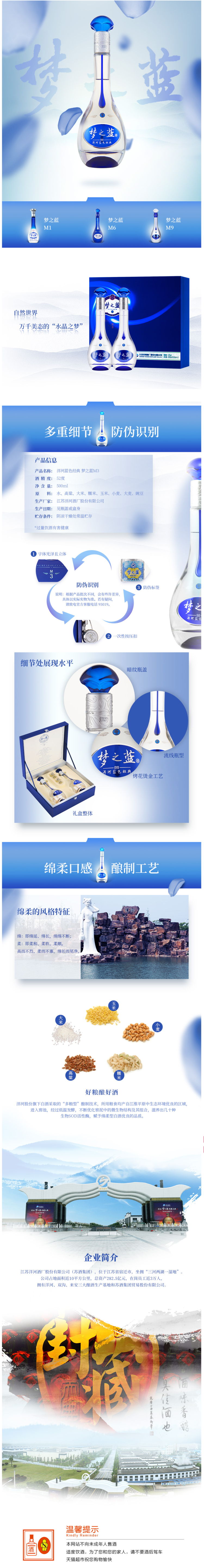 洋河“蓝色经典”系列酒从低到高有:邃之蓝、海之蓝、高之蓝、天之蓝、遥之蓝、梦之蓝。其中梦之蓝是“蓝色经典”系列中定位最高端的酒款,从低到高又分M1(电商版)、M3、M6、M9四种不同定位版本。