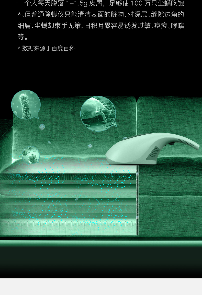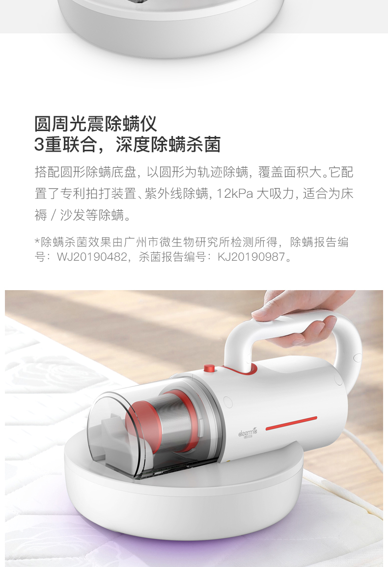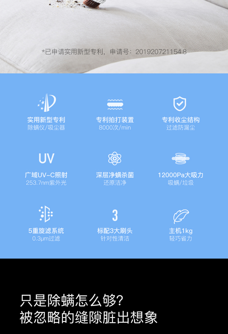 每分钟8000次专利拍打装置、12000Pa大吸力,在配合紫外线灯管既可以有效除螨,专利收尘装置,过滤排出清洁空气,避免二次污染;杀菌除螨率达到大于99.9%。