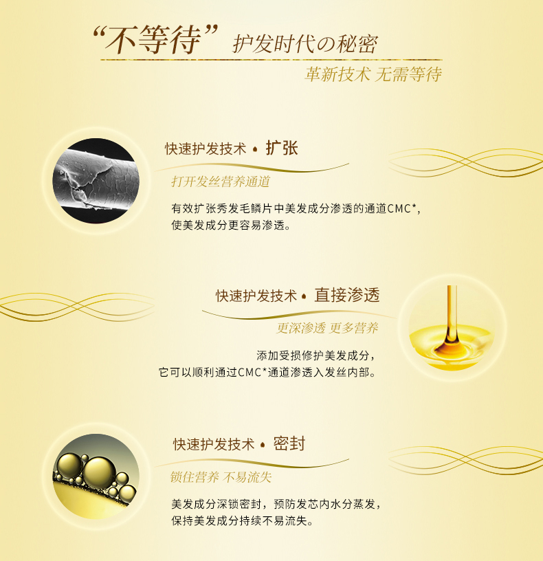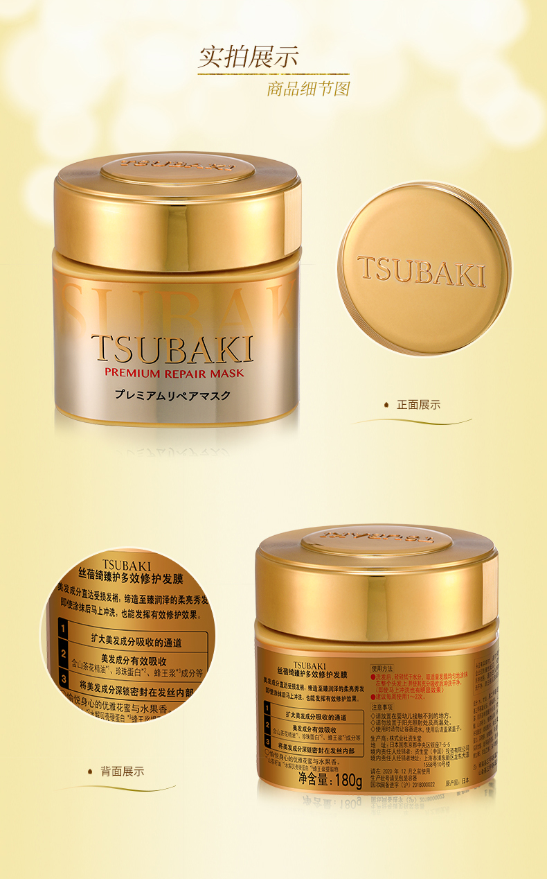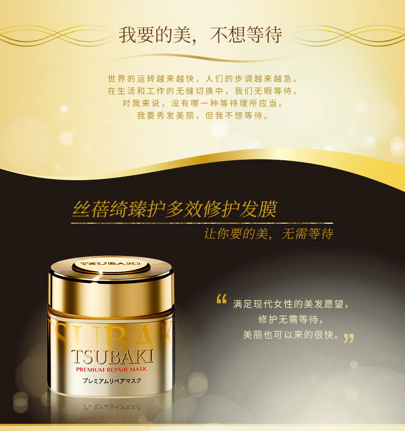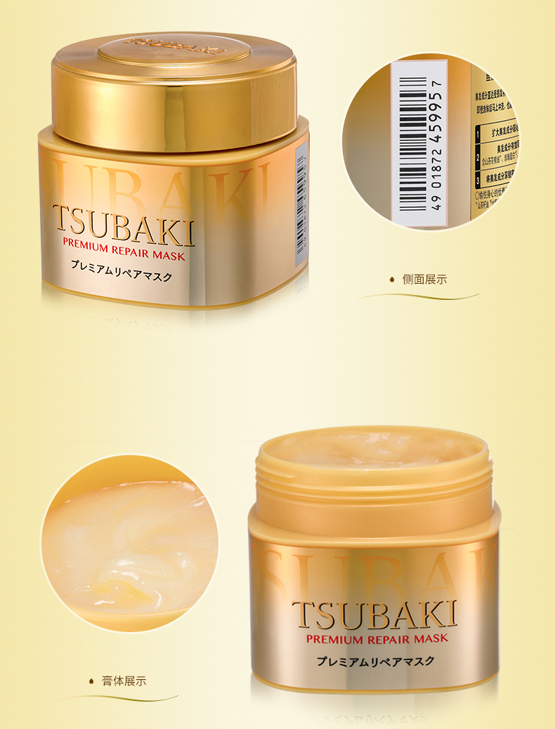 这款TSUBAKI 丝蓓绮 0秒奢华修复发膜,闪耀金黄色的瓶身,成分为双重氨基酸,玻尿酸,高浓度椿油,珍珠蛋白质,蜂王浆和甘油,修护保湿,使头发更有光泽,质地颜色为浅黄色,0秒的意思就是官方宣称涂抹到头发上不需要等,直接就可以冲洗掉。高浓度的发丝滋养成分再搭配革新性的渗透技术,能让美发成分直达发芯,同时闭合毛鳞片将这些成分锁在发丝内部~