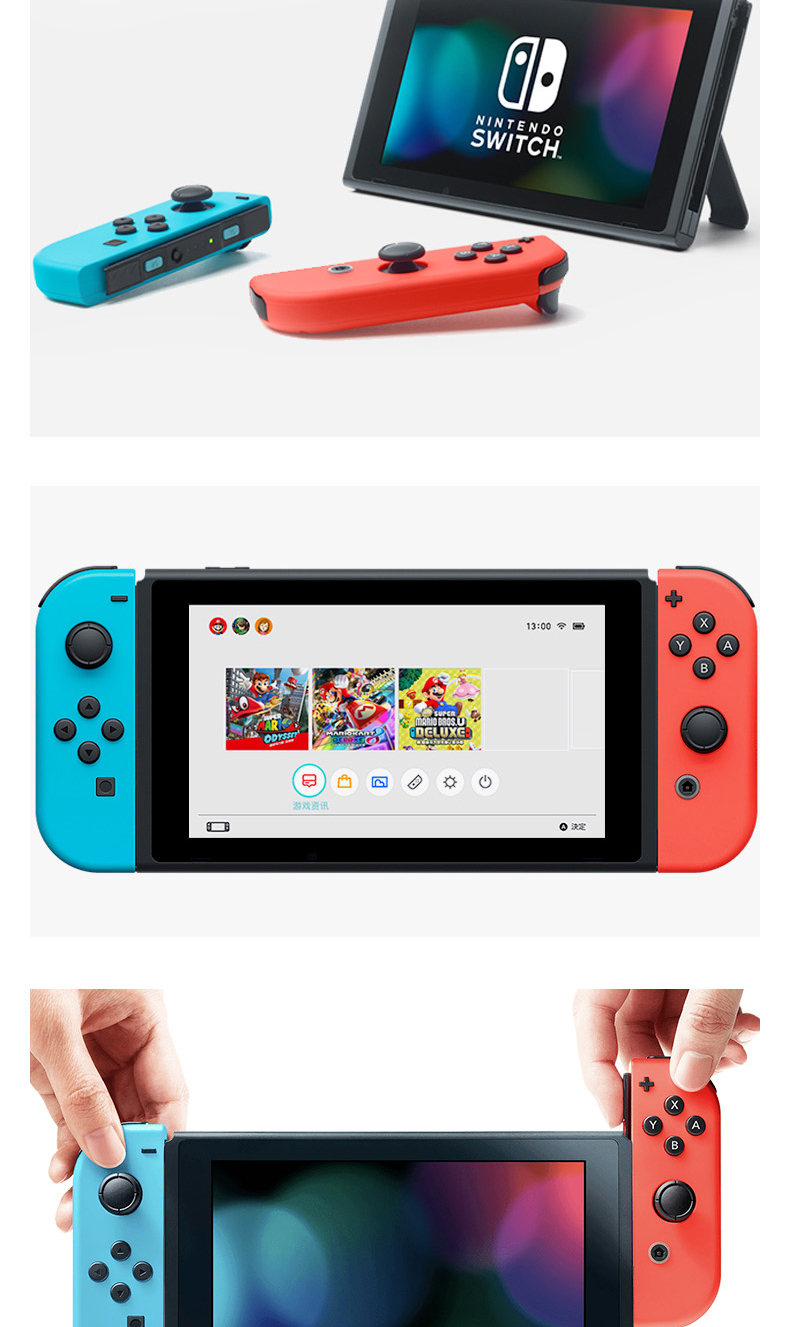 任天堂(Nintendo)Switch是2016年发售的游戏主机,也任天堂最新一代游戏主机,采用了掌机/家用主机二合一设计,运算核心均集中在掌机本体部分,连接电视的“主机”底座,仅起到画面输出以及充电的作用。标准套内包含:主机、底座、Joy-Con手柄一对、手柄挂座。