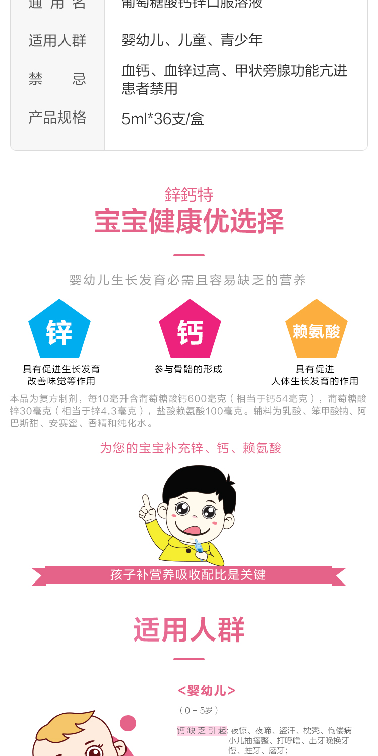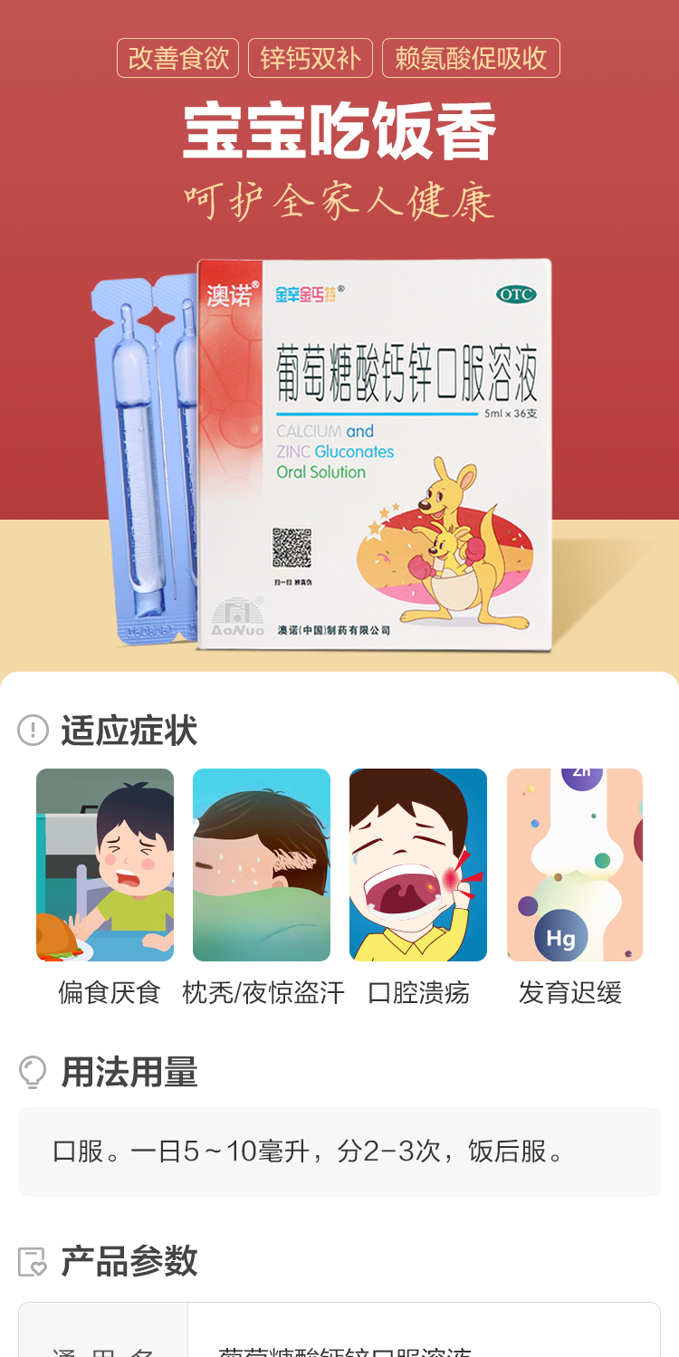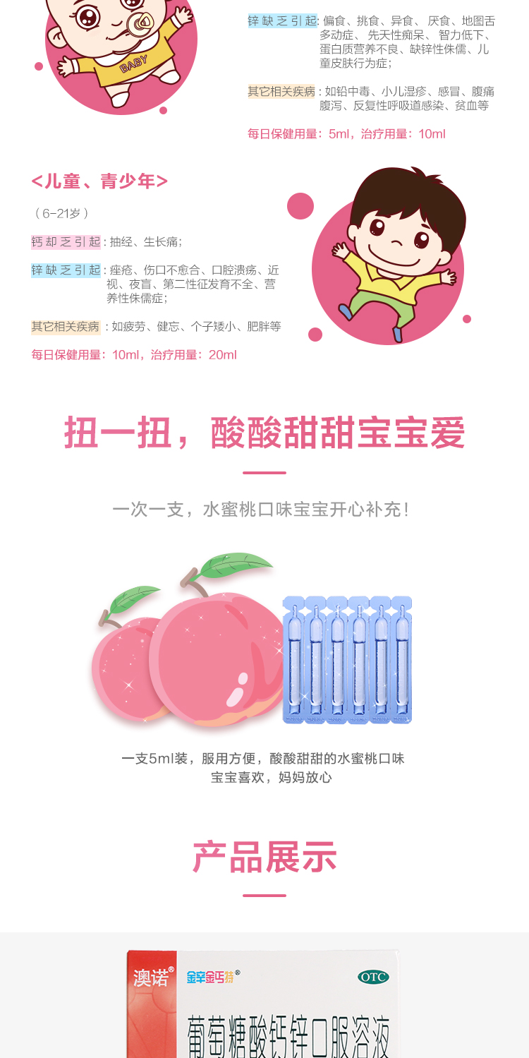 这款葡萄糖酸钙锌口服液,专为0-6岁的婴幼儿设计,水蜜桃口味,酸甜好喝,主要适用于偏食厌食、夜惊盗汗、口腔溃疡和儿童发育迟缓,钙锌同步,还特别添加赖氨酸,促进孩子生长发育。