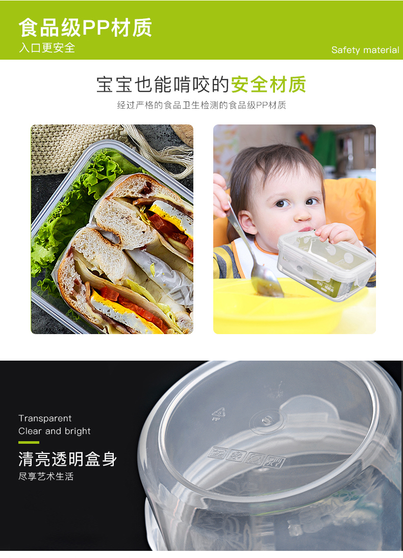 这款安立格 透明塑料保鲜盒,所用材质是经过严格的食品卫生检测的食品级PP材质,安全无毒;四面锁扣,密封保鲜防漏,确保隔绝空气,减少水分和营养成分流失。耐-20℃低温冷藏、120℃高温加热,日常居家必备。