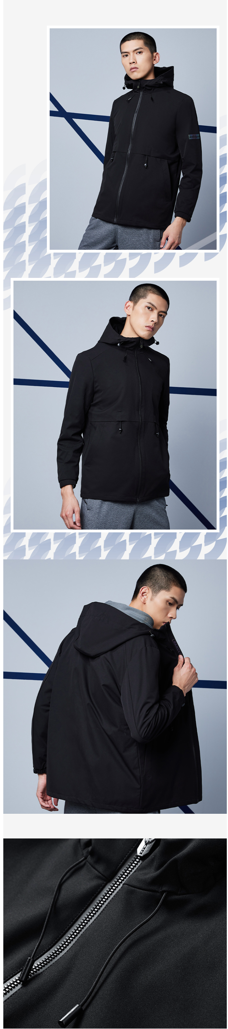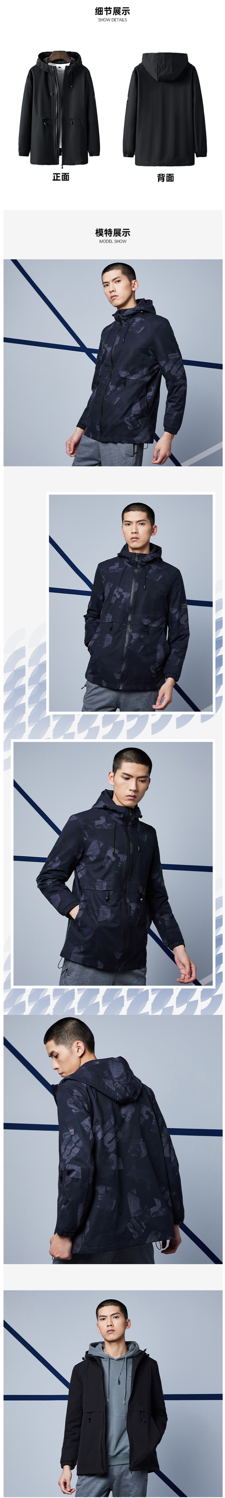 在款式上,合身版型,经典运动风衣款设计,加大加宽的头盔式防风帽,搭配半高领,能很好的防风不漏风,腰部有抽绳,可以调节松紧更显修身。