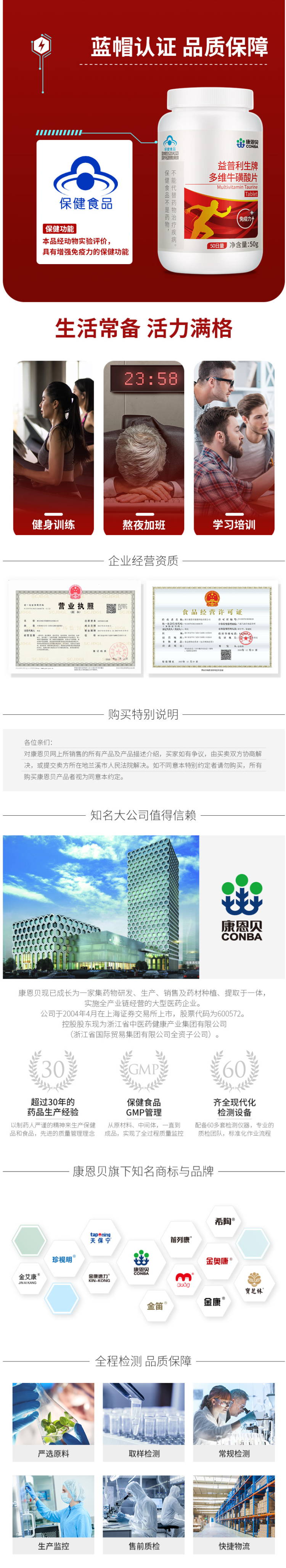 这款康恩贝 多维牛磺酸片,4重营养力的组合配方—牛磺酸、维生素B1、维生素C、维生素E,能补充身体营养所需,增强免疫力。