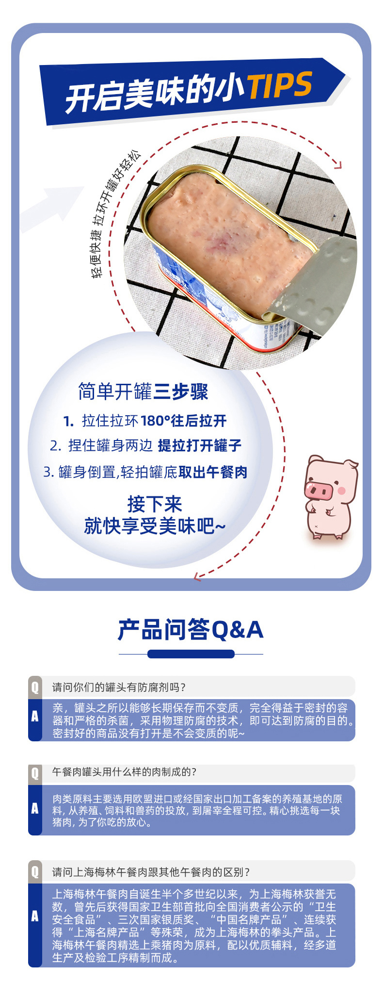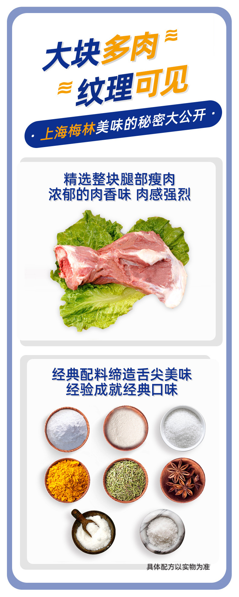 这款梅林的火腿猪肉罐头使用的是午餐肉的最高国标,投肉量≥90%,精选整块腿部瘦肉,大块的肉粒,浓郁的肉香,瘦肉多肥肉少,纹理清晰可见,梅林近百年的罐头生产经验,口感口味超好。