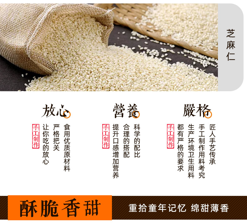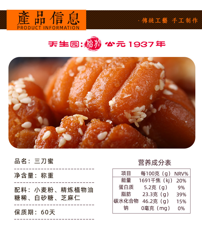 这款三刀蜜采用优质小麦粉、植物油和糖稀、芝麻仁等,传统工艺制作而成。口感酥脆香甜、香甜不腻。经过多部门检验合格,品质靠谱。规格:500g/份。