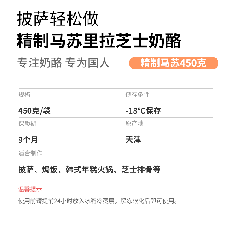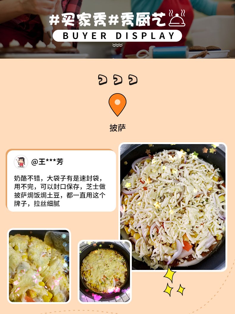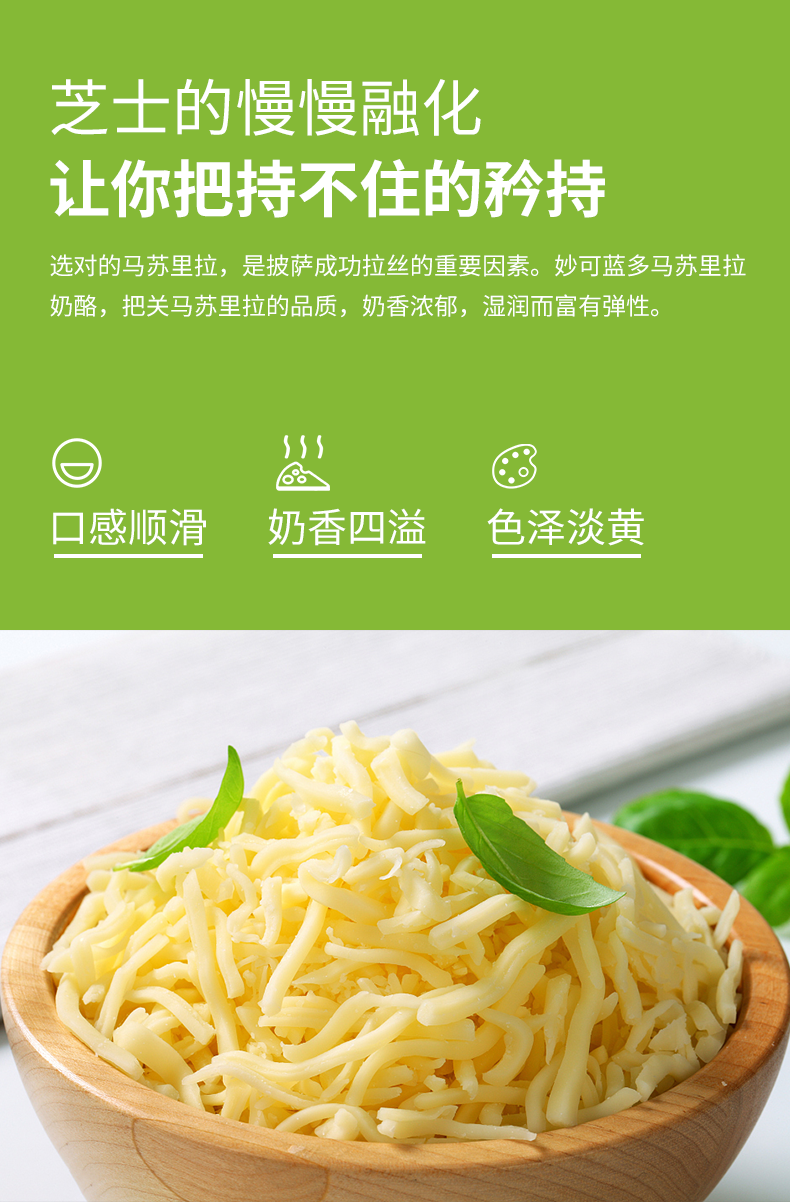 这款妙可蓝多马苏里拉奶酪,严选优质乳源,奶香浓郁,口感柔和,钙含量高,不含食用香精,细丝状设计,切丝细腻,相比于片装式的奶酪,减少了切丝的程序,使用更加方便。可以制作焗饭、炒饭、披萨,还可以当做烘焙原料,泡面的时候加上一些也会更好吃。