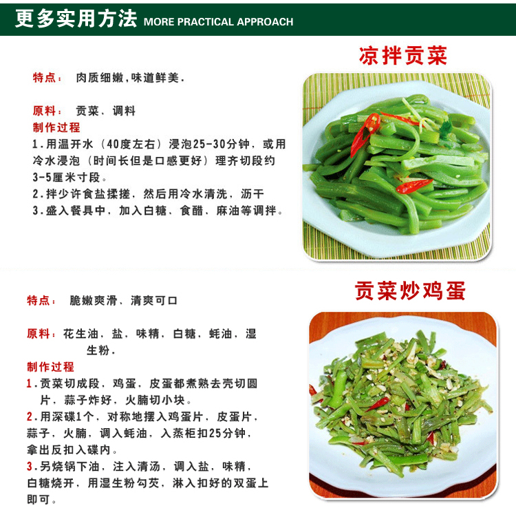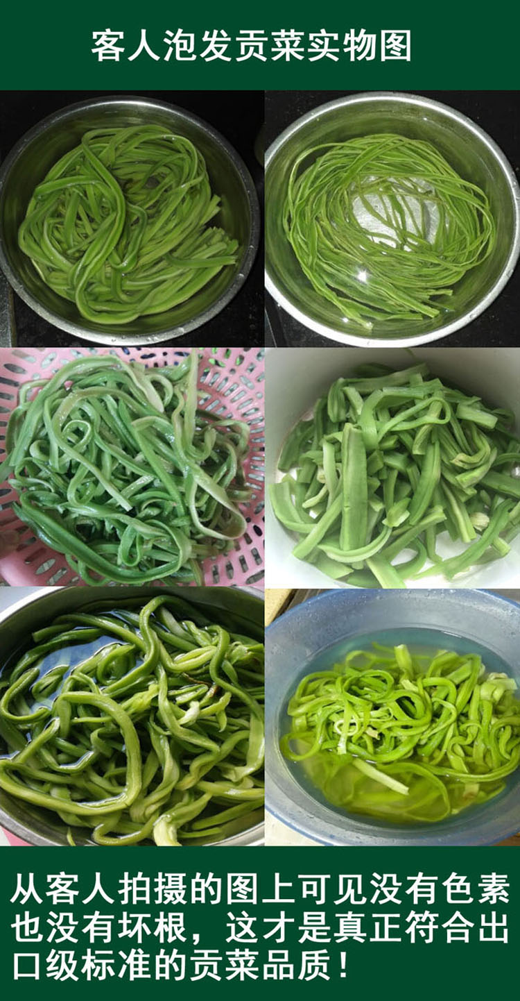PS:到手后是已经脱水的贡菜,食用之前用水泡发即可,平常可以存放于冰箱中。