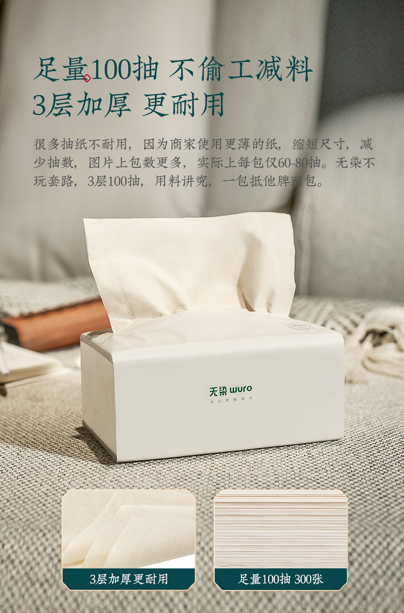 天猫wuro无染旗舰店59.9元,可领20元优惠券,实付39.9元到手,规格是3层*100抽*24包,单张尺寸是139*190mm。