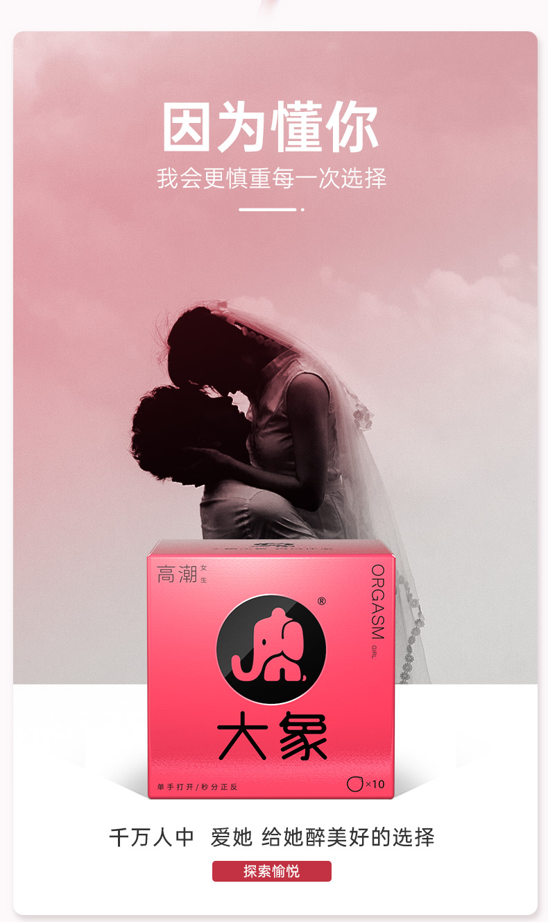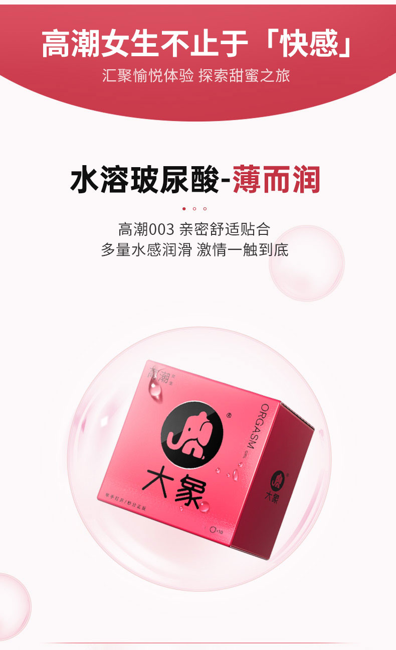 这款大象 高潮女生系列避孕套,采用天然乳胶材质制成,特点是高弹,粘连时成膜性能良好,更具柔韧性,在猛的冲击都不怕。专利牛油盒设计,单手可开,秒分正反。