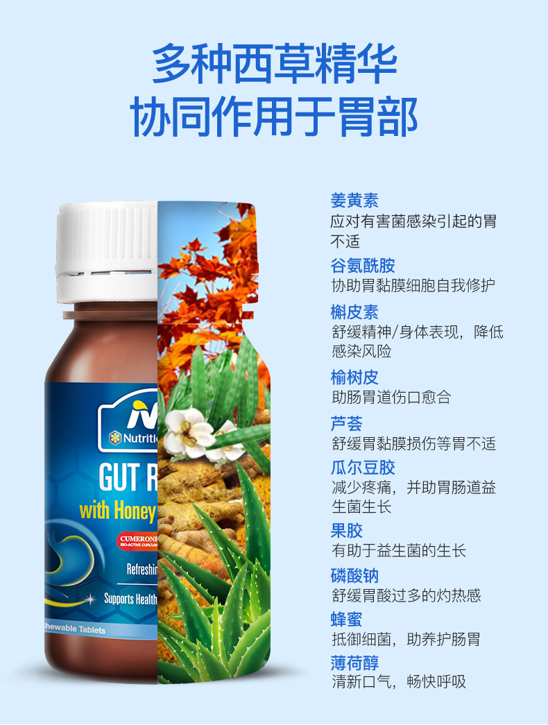 复合配方含有姜黄素、谷氨酰胺、槲皮素、芦荟、薄荷油、榆树、瓜尔豆胶、果胶、磷酸二钠、蜂蜜、10种有效成,协同作用效果更好。2000mg高含量谷氨酰胺+专利姜黄素(Cumerone) 配方比普通姜黄素提取高出多倍,更有效应对幽门螺杆菌,能帮助受损细胞修护胃黏膜。还特别添加天然蜂蜜,与肠胃系统营养物质相结合,更好地舒缓肠胃,减压肠胃消化负担。