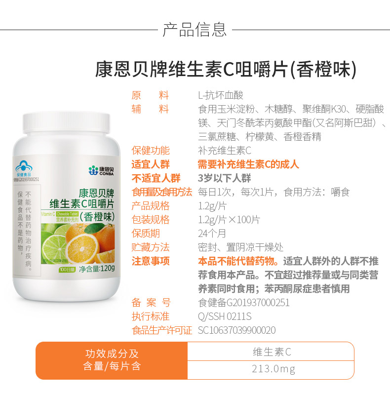 这款康恩贝 维生素C咀嚼片,每片当中有维生素C 213mg,适合经常运动、骨骼牙齿不健康、体质弱、长期抽烟喝酒等人群。不适宜婴幼儿、少年儿童、孕妇、乳母,每日1次,每次1片,咀嚼食用。