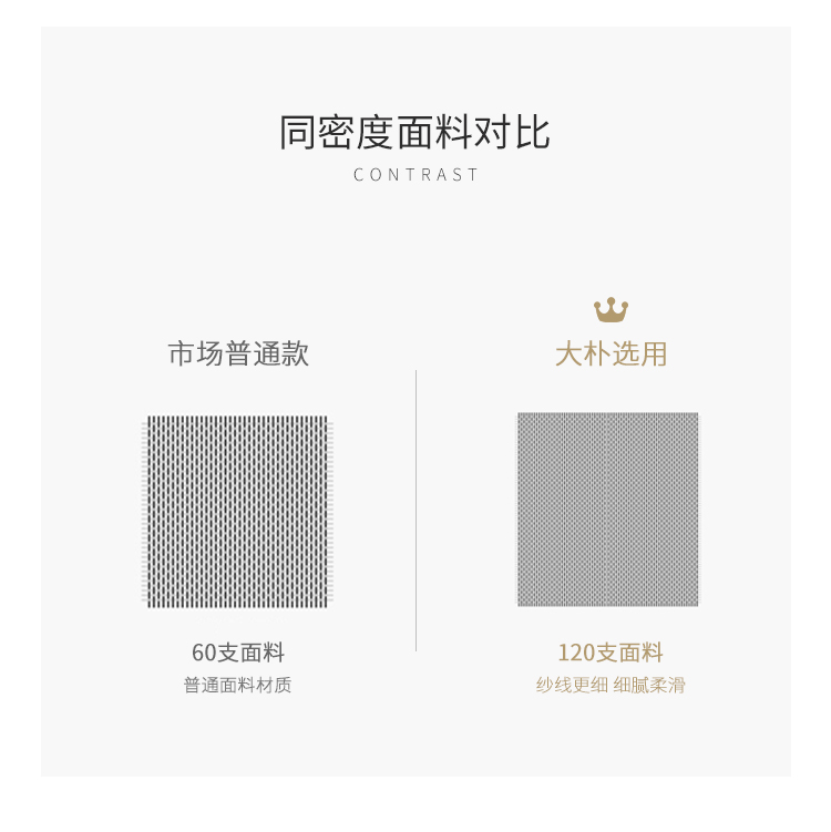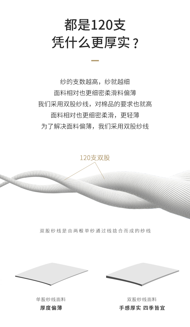 精选新疆优质长绒棉为原料,采用120支500根双股织造,面料奢华,丝光预缩工艺,犹如丝绸般的细腻光泽,洗涤后不易缩水,多次使用不失品质感,采用双股纱线,面料不会显的太薄,触感也更丰润舒适。国家A类安全标准,使用安心。