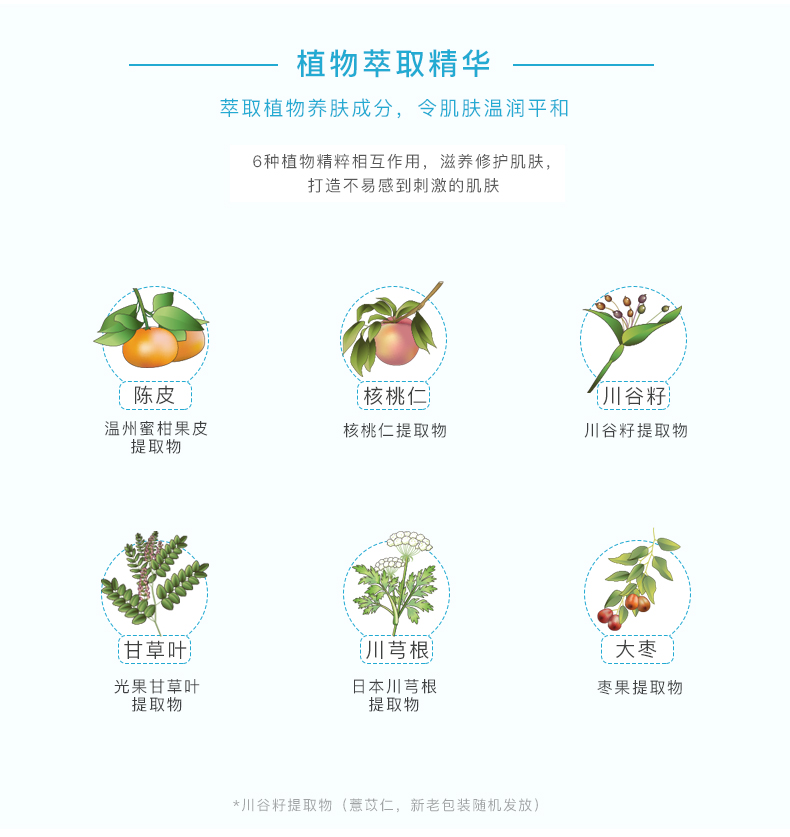 萃取了植物养肤成分,令肌肤温润平和。里面的成分含有陈皮,核桃仁,川谷籽,甘草叶,川芎根,大枣,6种植物精粹相互作用,滋养修护肌肤。