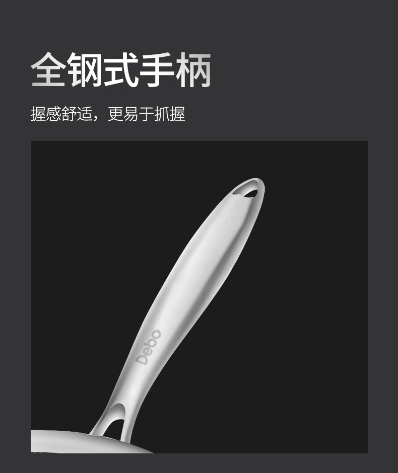细节上,人工力学握柄设计,轻松把握;锅身与握柄采用重压铆钉加固,久用不变形,细节精致到位。